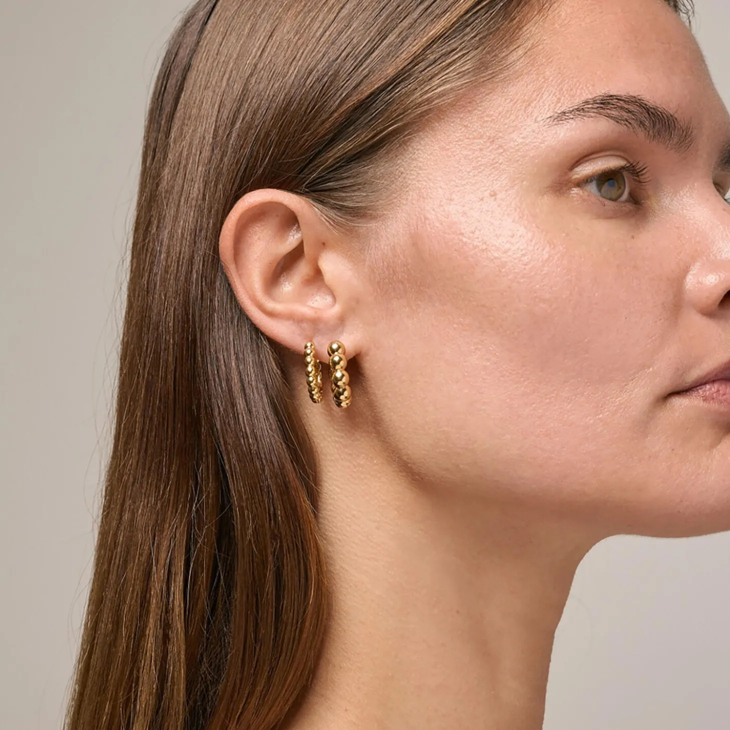 Disse små kuglehoops i 925 sterlingsølv, belagt med 18 karat guld, er et par rigtig gode hverdagsøreringe designet i en klassisk stil. De er enkle, som vores klassiske hoops, men med et lidt mere cool og karakterfuldt udtryk. De små, guldfarvede ball hoops er lette, så du nemt kan style dem med andre øreringe uden at tilføje for meget vægt til øreflippen. Ball hoops fås også i en større størrelse samt i rent 925 sterlingsølv.