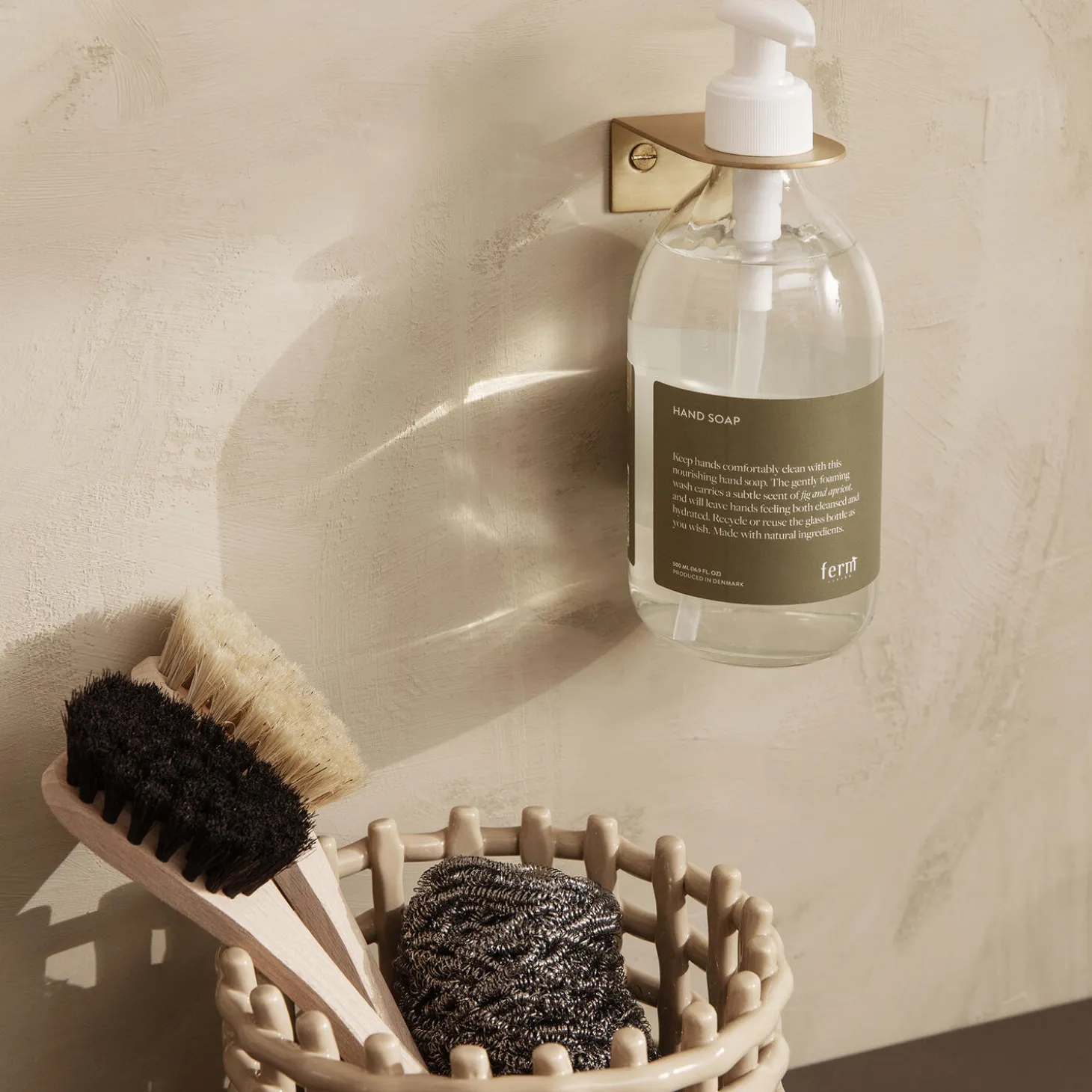 Basho Wall Hanger hjælper dig med at frigøre værdifuld plads på overfladen omkring vasken i køkkenet eller på badeværelset, fordi du kan hænge dine rengørings- og håndplejeprodukter på væggen. Denne praktiske og elegante vægmonterede løsning er lavet af massiv mæssing og har en fin belægning af klar lak, der gør det nemt at tørre vand og sæberester af. Passer til alle flasker fra vores Care & Cleaning Collection.