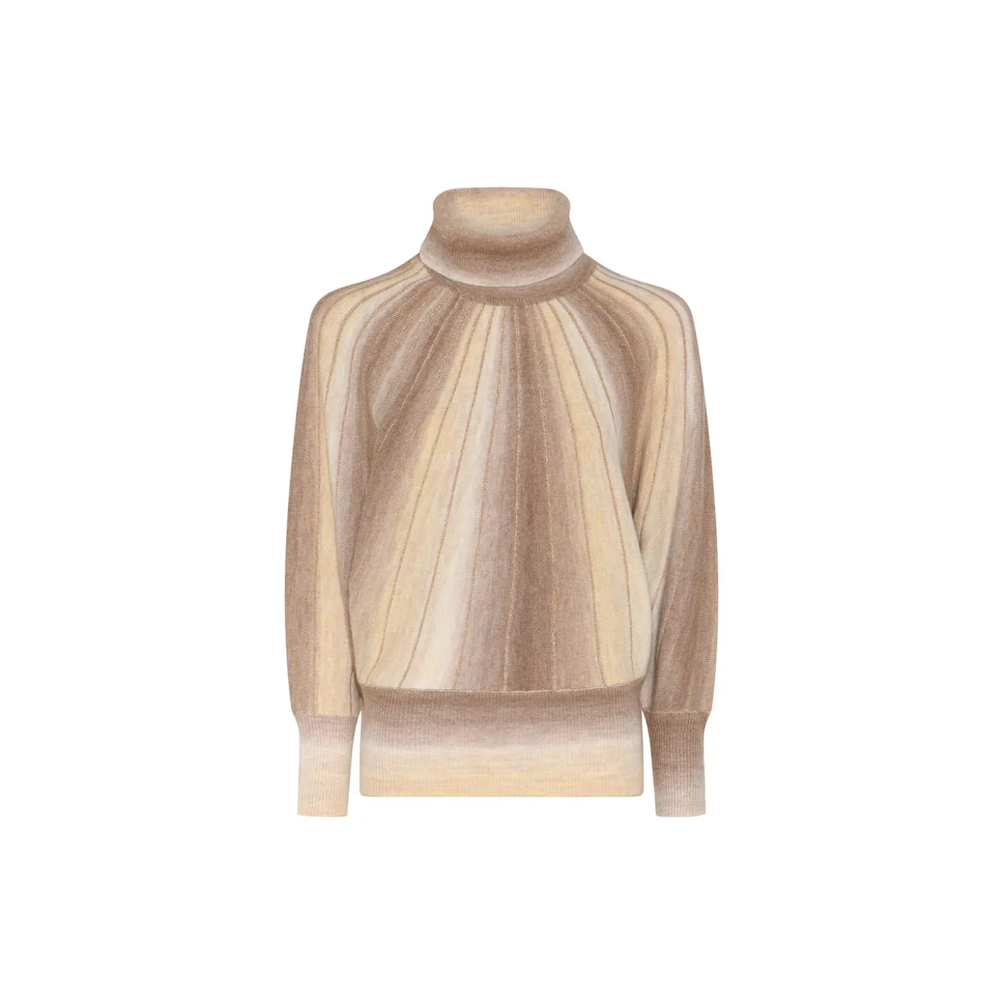 Elegant striktrøje med høj hals og unikt faldende mønster. Perfekt til at skabe et sofistikeret look på kolde dage.