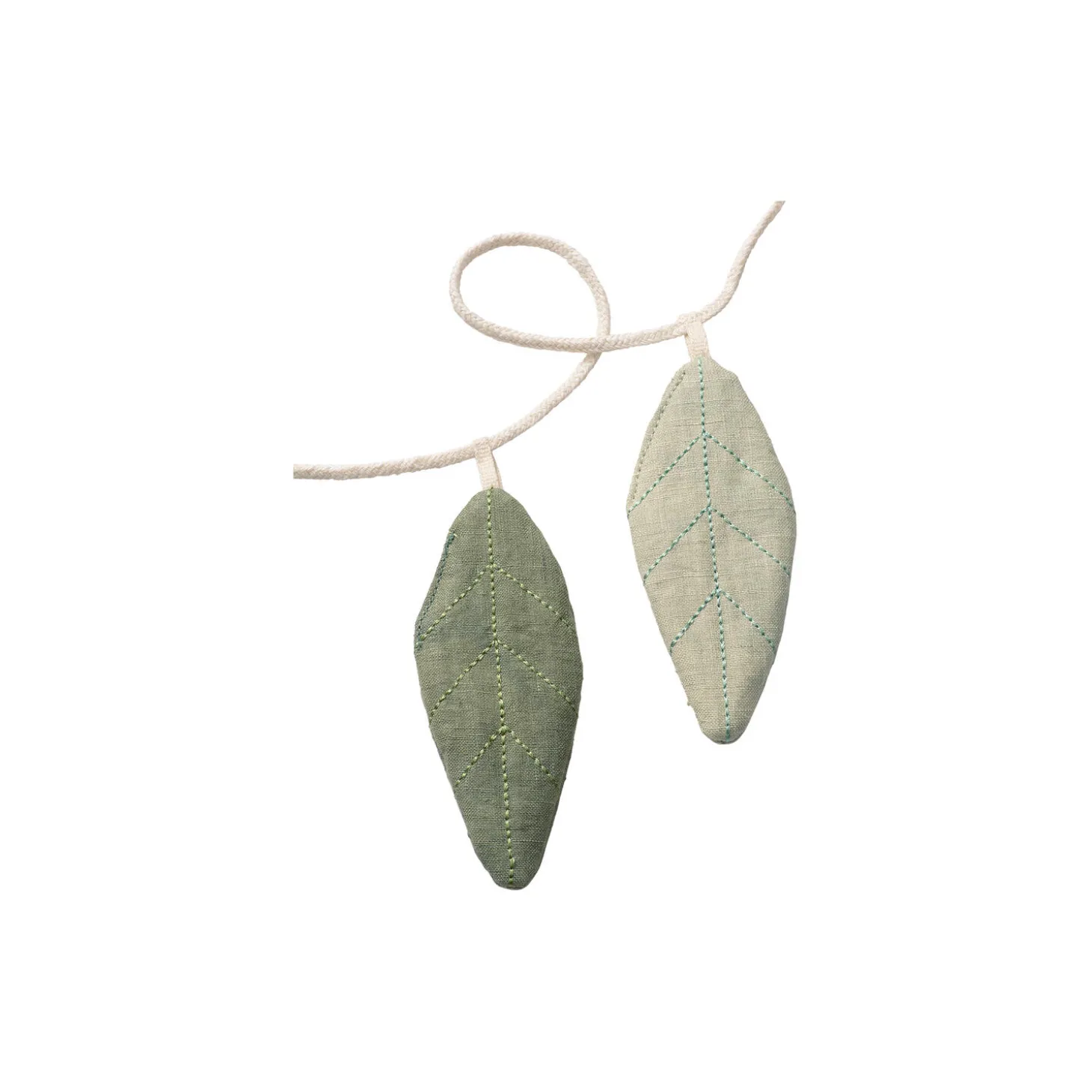 En guirlande er en skøn tilføjelse til børneværelset. På en himmelseng eller en babyseng, som vægdekoration eller i et vindue. Denne guirlande har 6 blade i 3 grønne nuancer på en bomuldssnor.