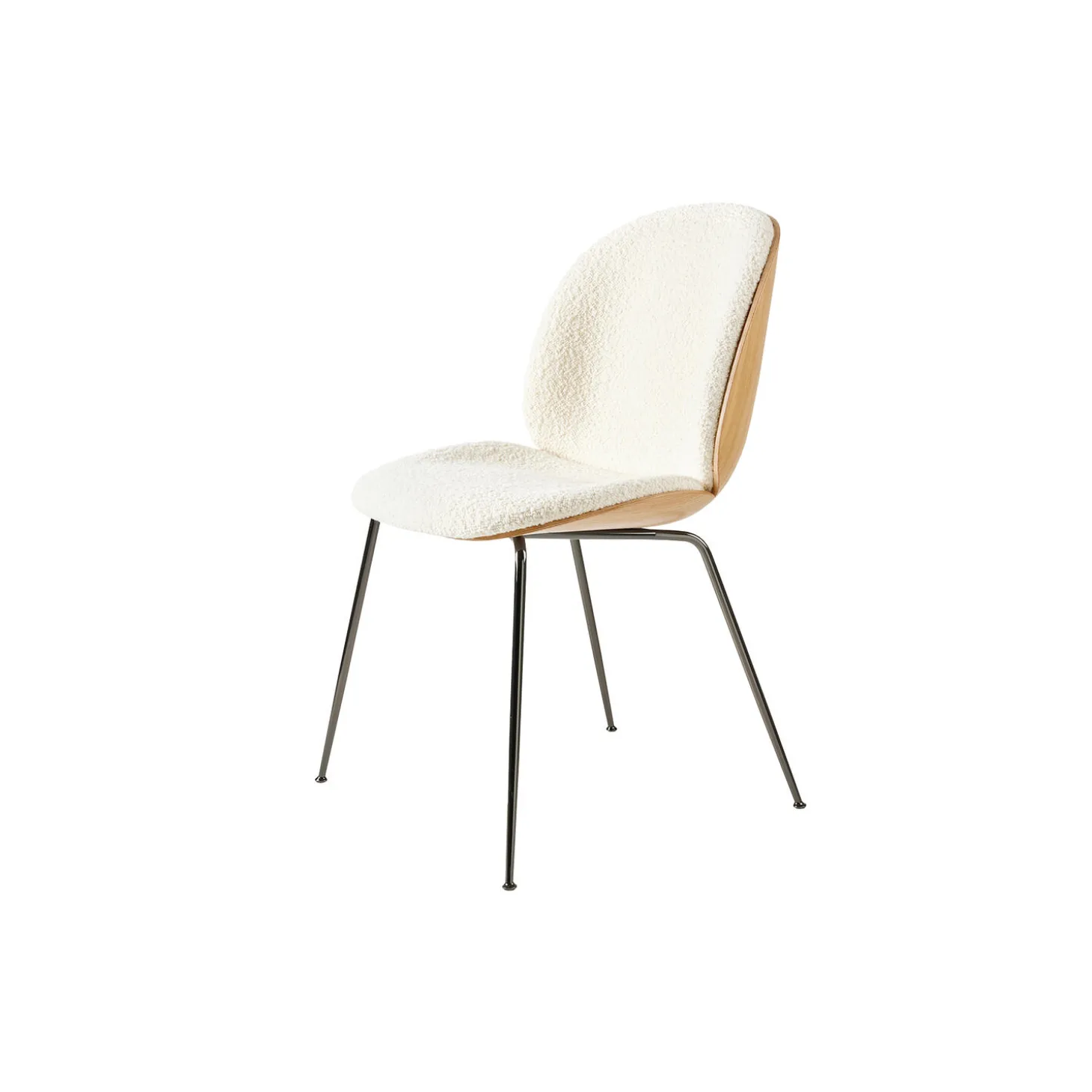 Beetle Dining Chair forsidepolstret i Karakorum 001 tekstil af Dedar, skal i semi matlakeret eg og stel i sort krom fra GUBI. Farve: Karakorum 001/black chrome. Mål: H: 87 x B: 56 x D: 58 cm. Siddehøjde: 45,5 cm. Design: GamFratesi.