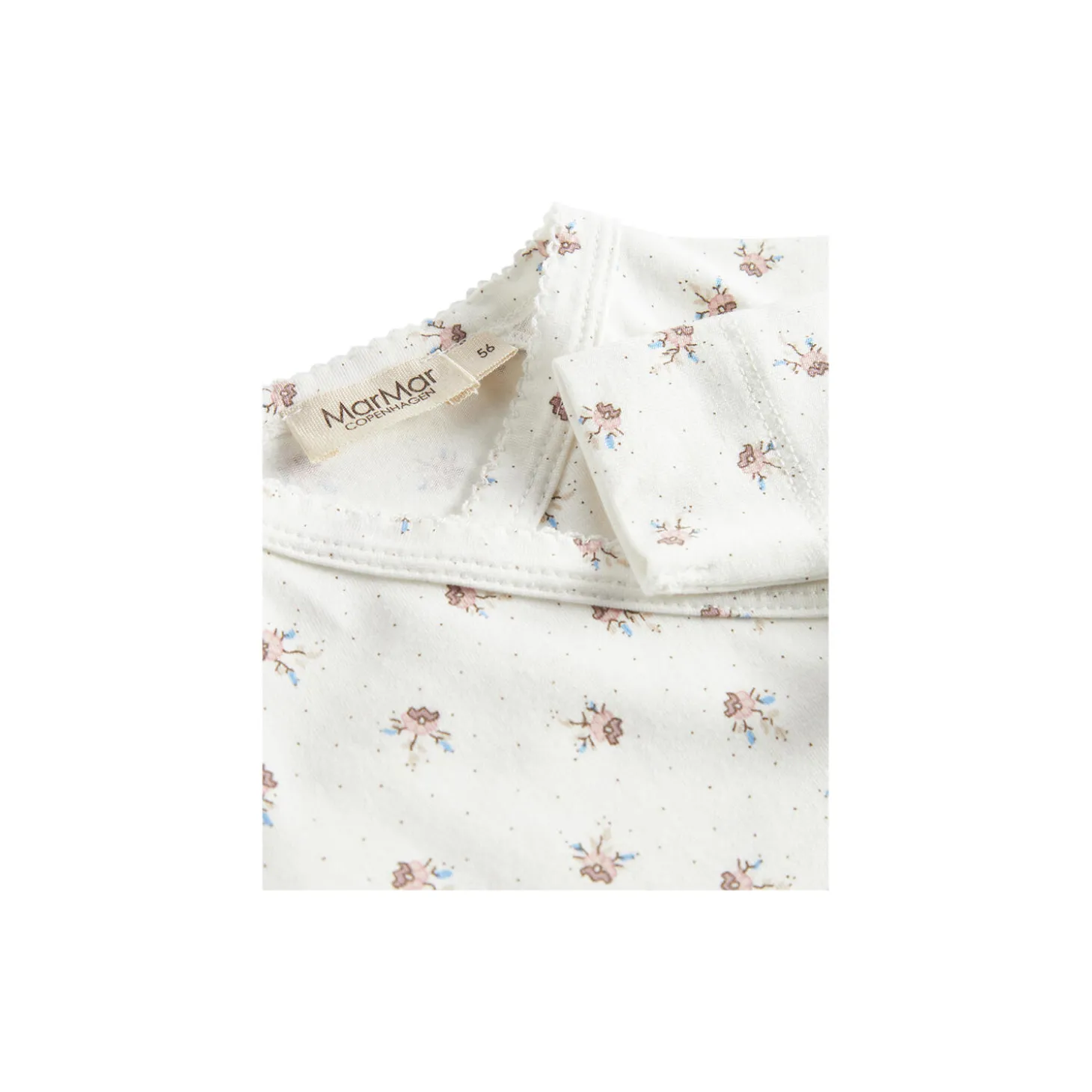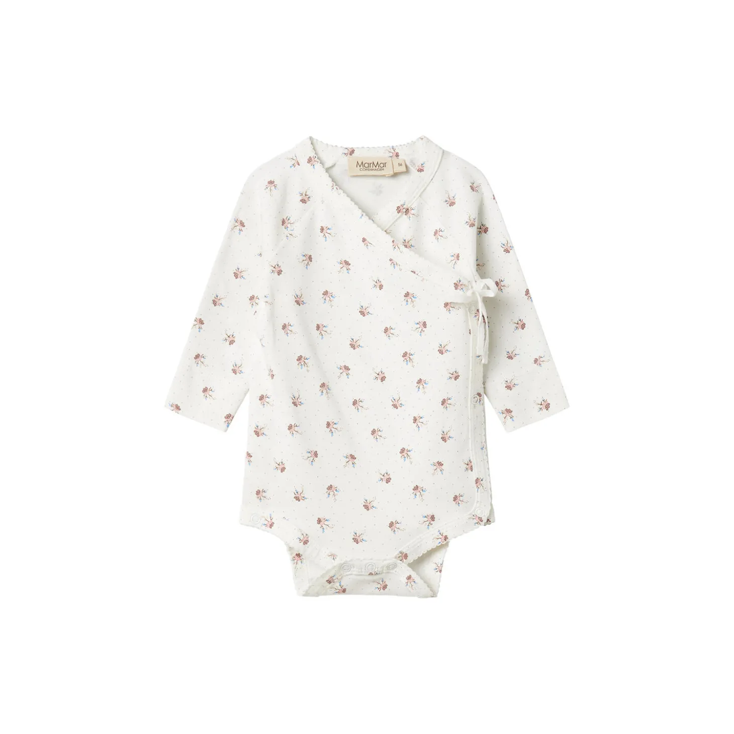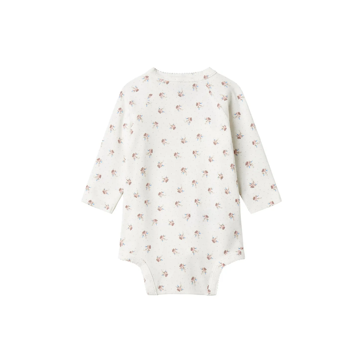 Langærmet bodystocking til nyfødte med slå-om-lukning. Lukkes med trykknapper og bindebånd.