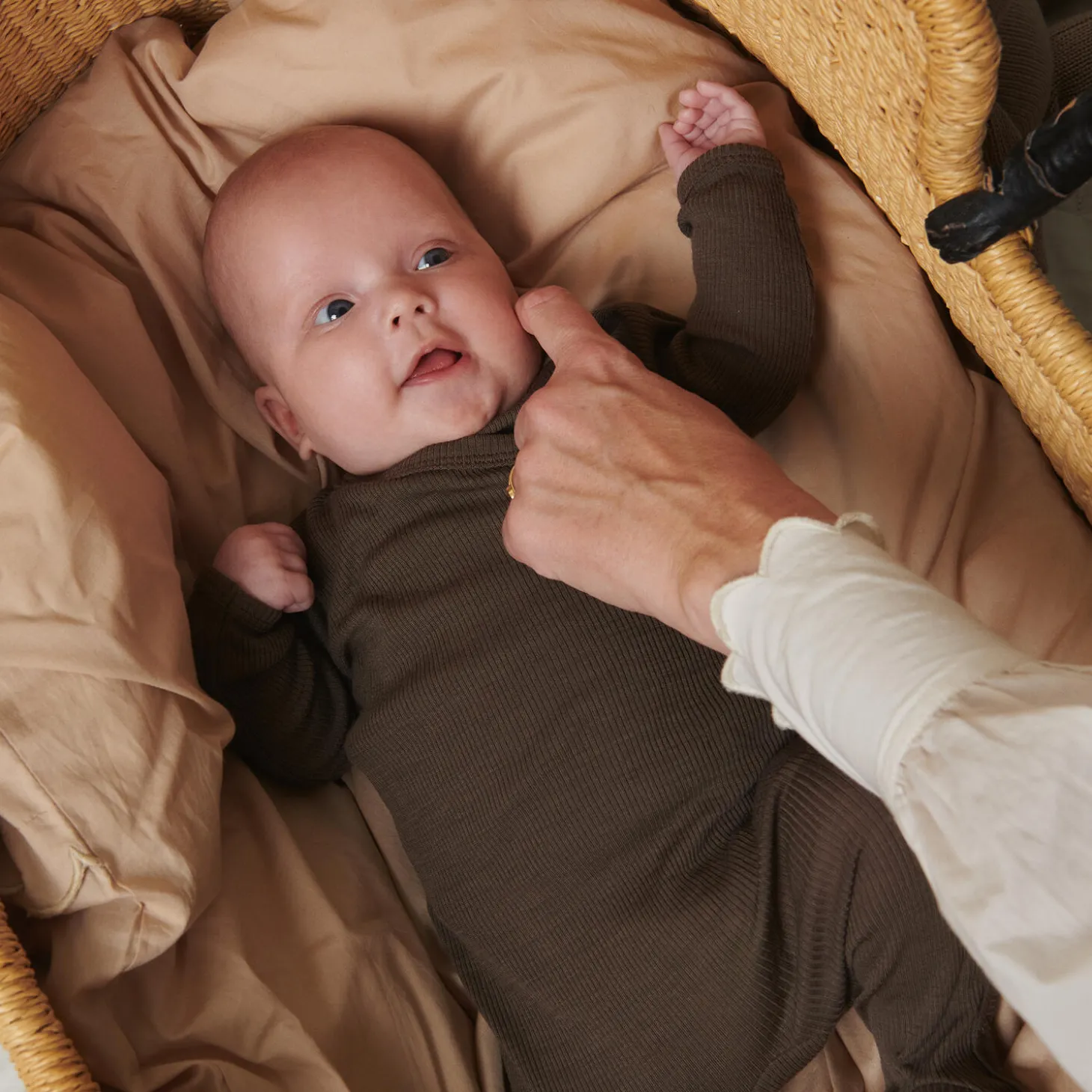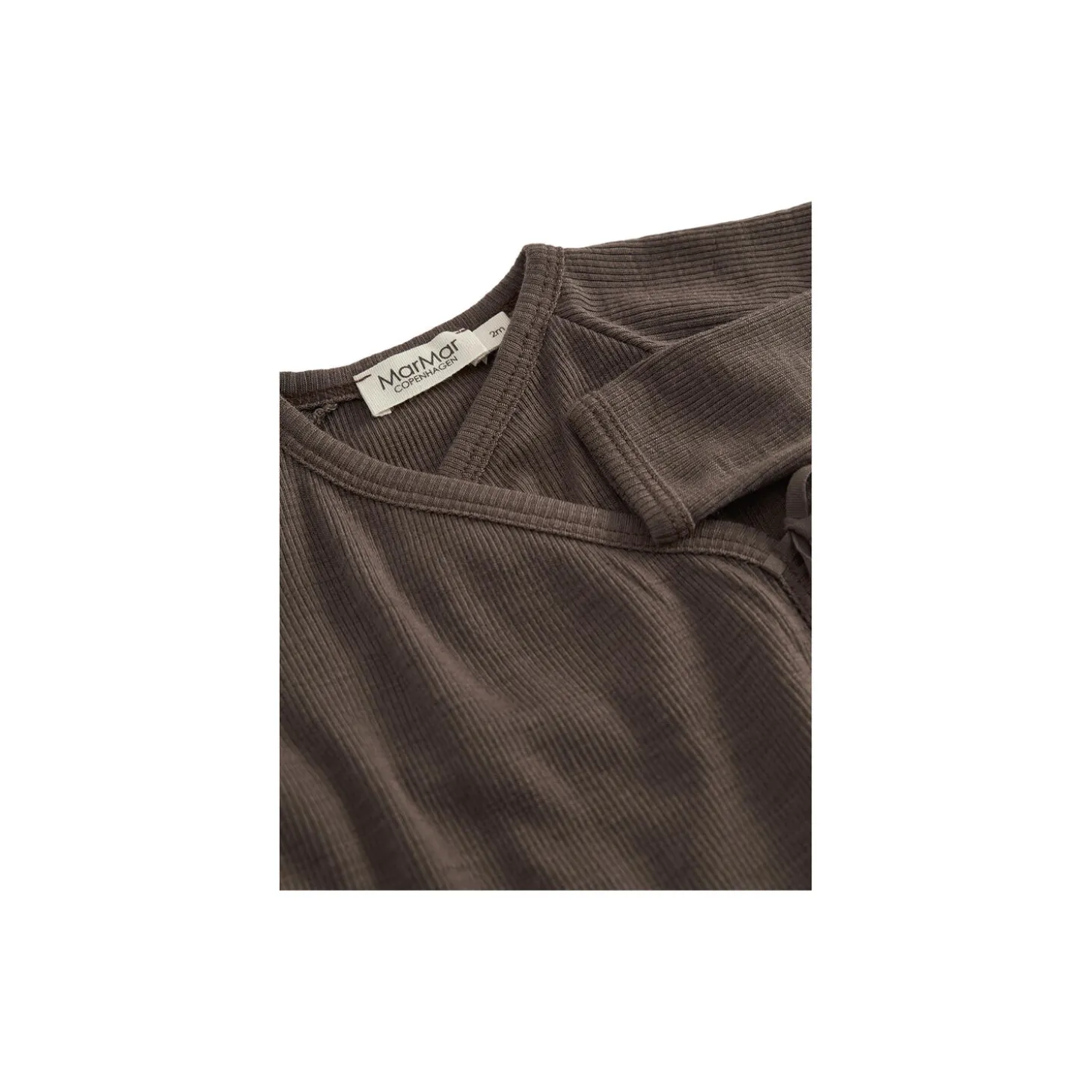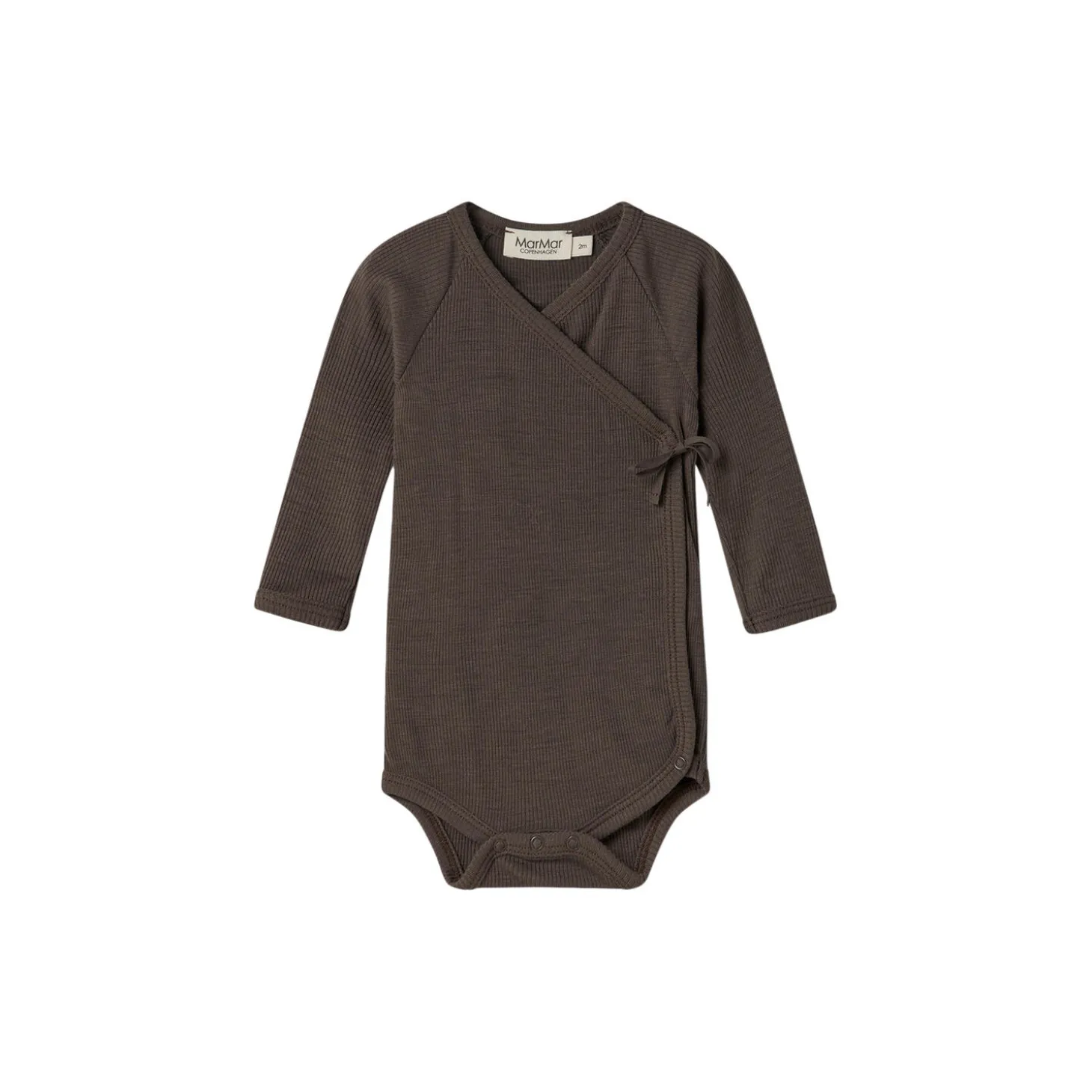Long-sleeved wrap bodysuit for newborns for easy changing. The bodysuit is closed with both snap buttons and ribbons