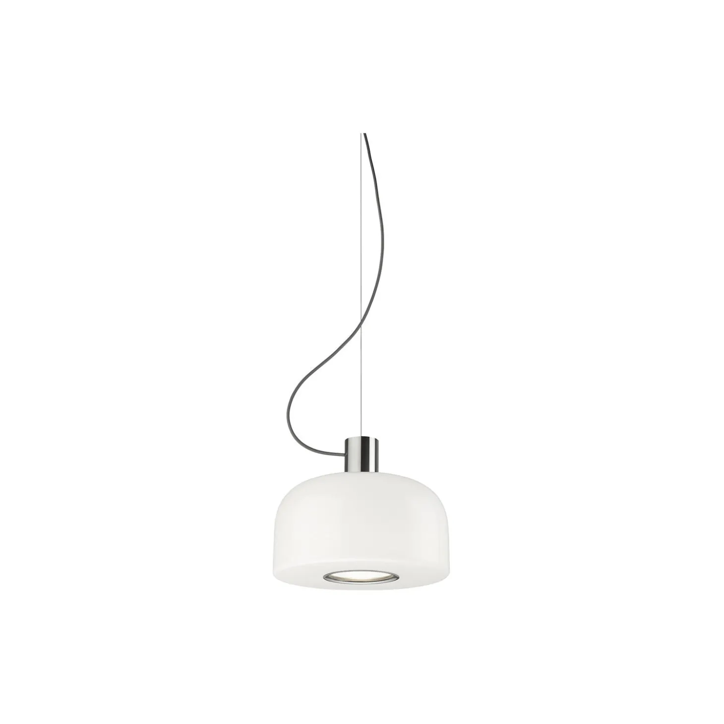 Bellhop Glass Suspension can be used as an ambient but also as a task light, which directly illuminates, with a non-blinding cone of light, the surface on which it is suspended. The hole in the bottom part of the lamp, protected by an aluminum element, is shaped to direct the light (and change the bulb) avoiding the diffusion up to the eyes of those sitting at the table. A cone of light is therefore created inside the suspended Bellhop Glass, which expands homogeneously in the environment on all sides and lands on the table precisely, like a torch, visually signaled by the colored aluminum ring that surrounds the lower opening of the lamp.
