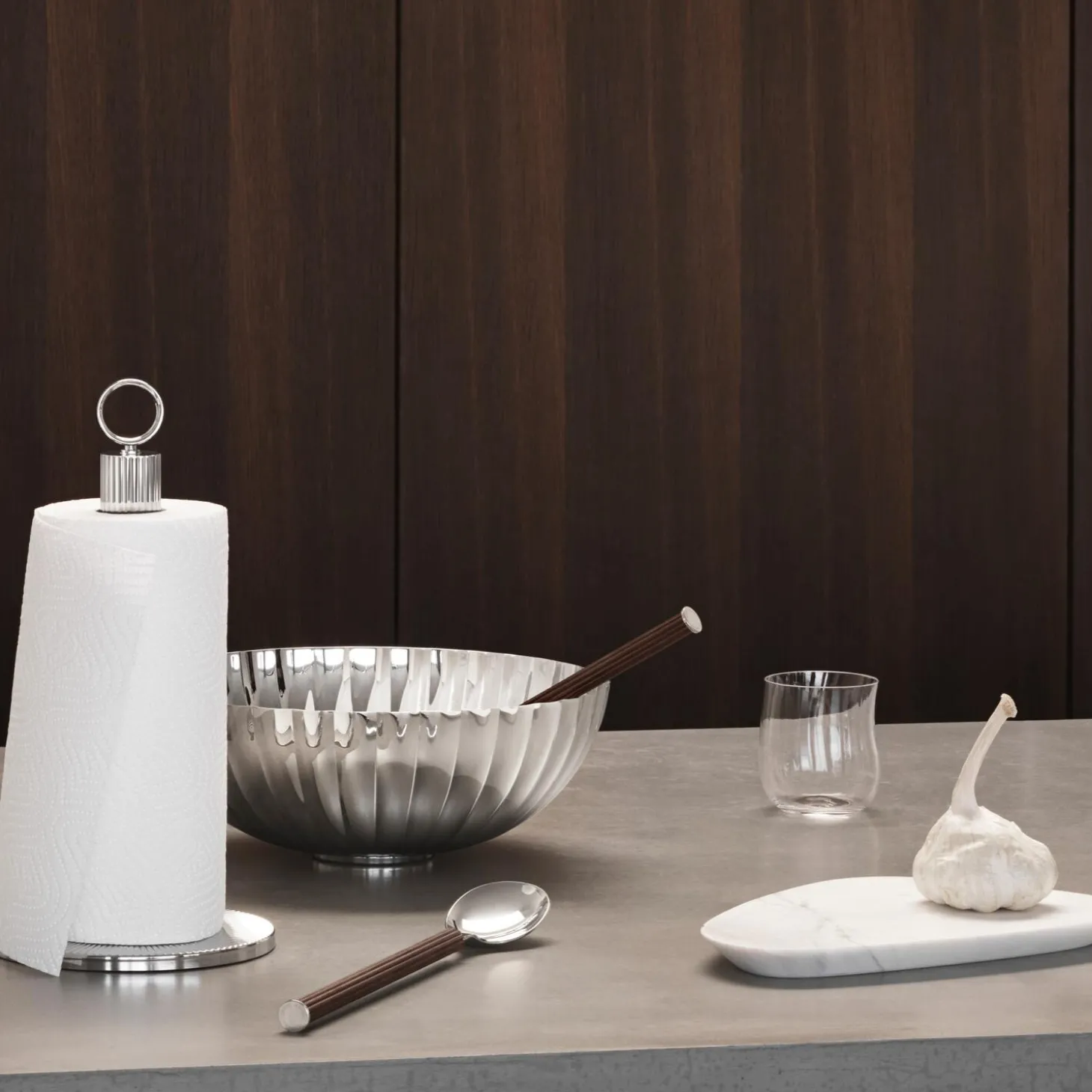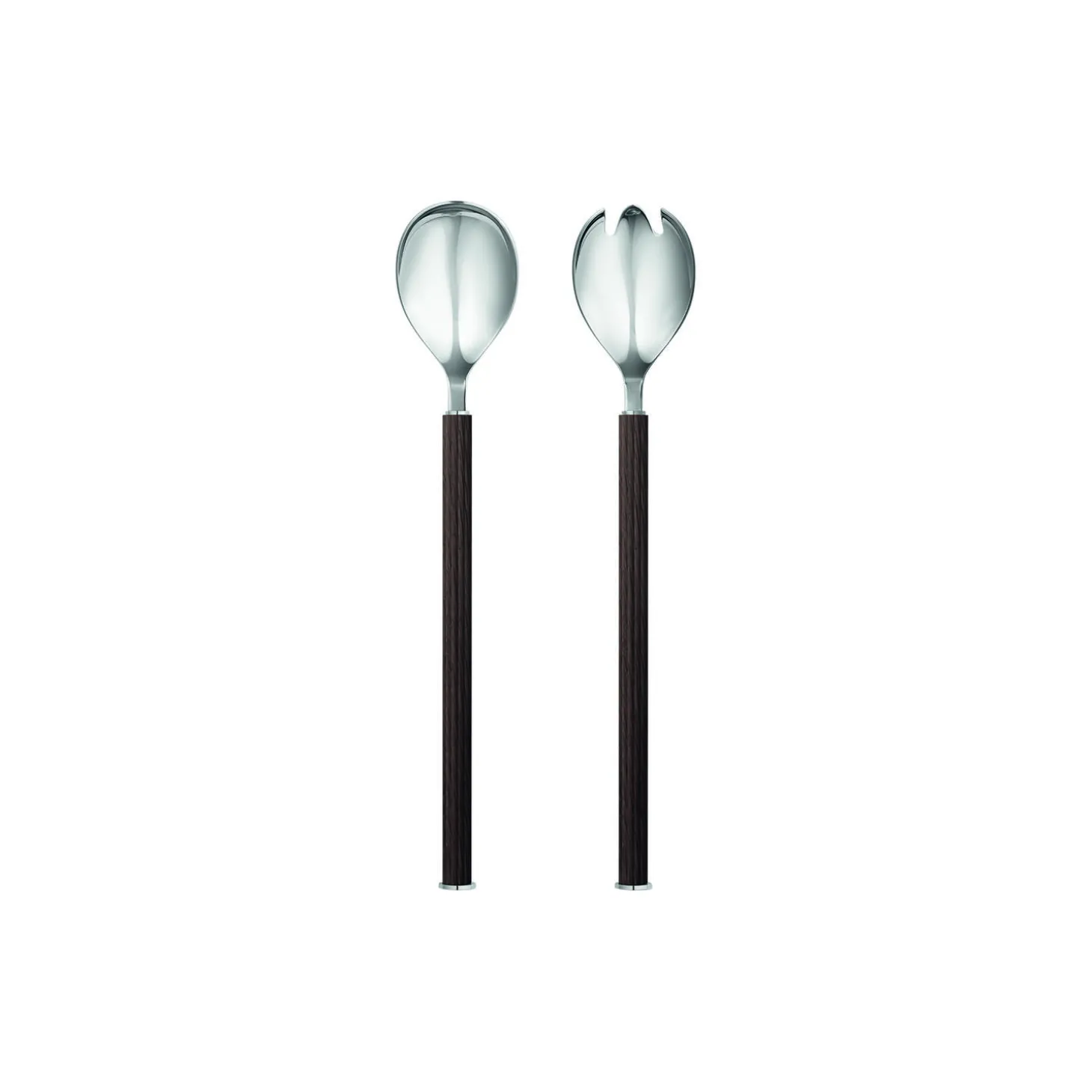 Servér salaten med et sofistikeret salatbestiksæt i blankpoleret rustfrit stål og håndtag i røget eg. Det elegante bestiksæt er udsmykket med de ikoniske riller, der kendetegner Georg Jensens tidløse Bernadotte kollektion.
