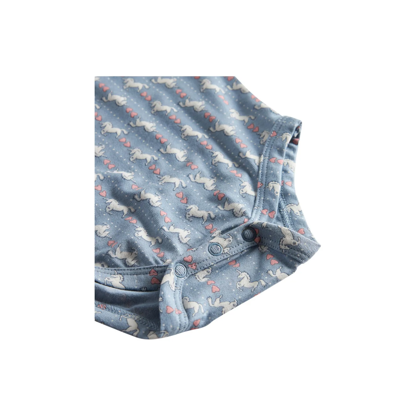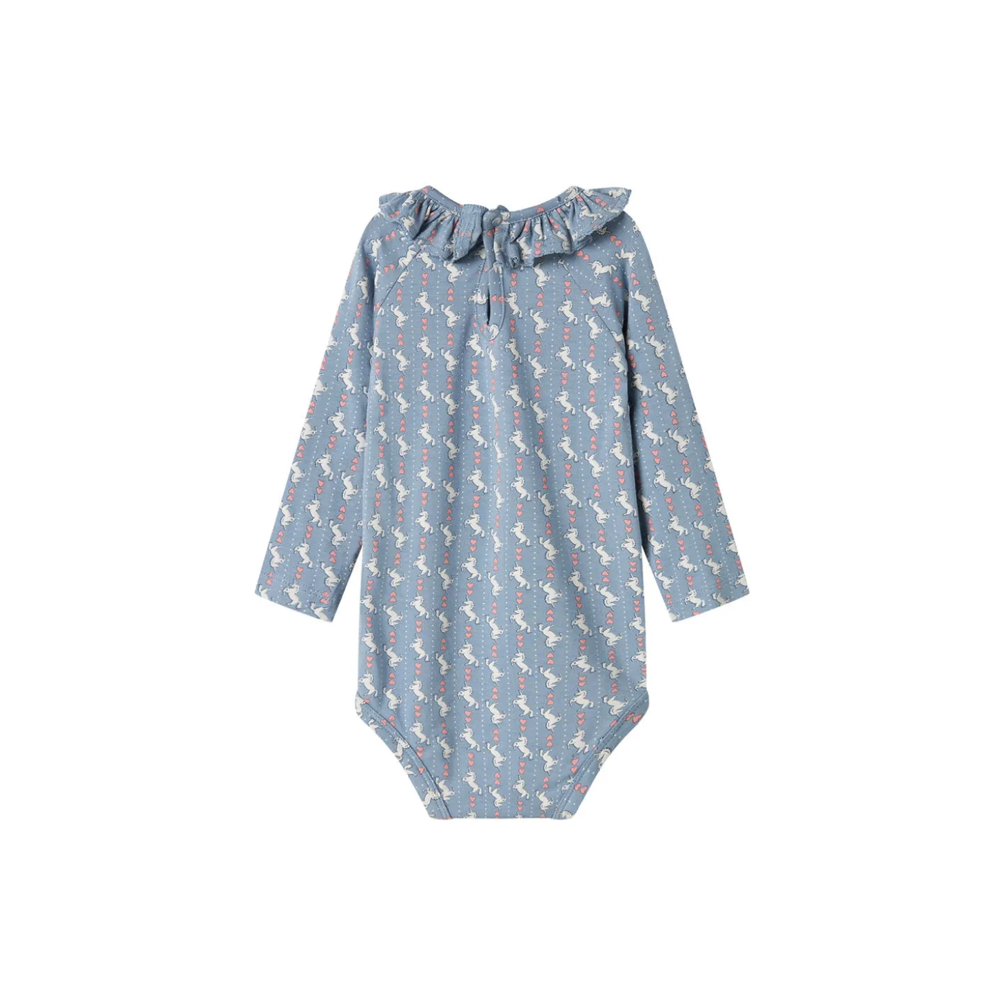 Langærmet baby bodystocking med flæsekrave, der bliver lukket med trykknapper på ryggen samt mellem benene for nem bleskiftning.