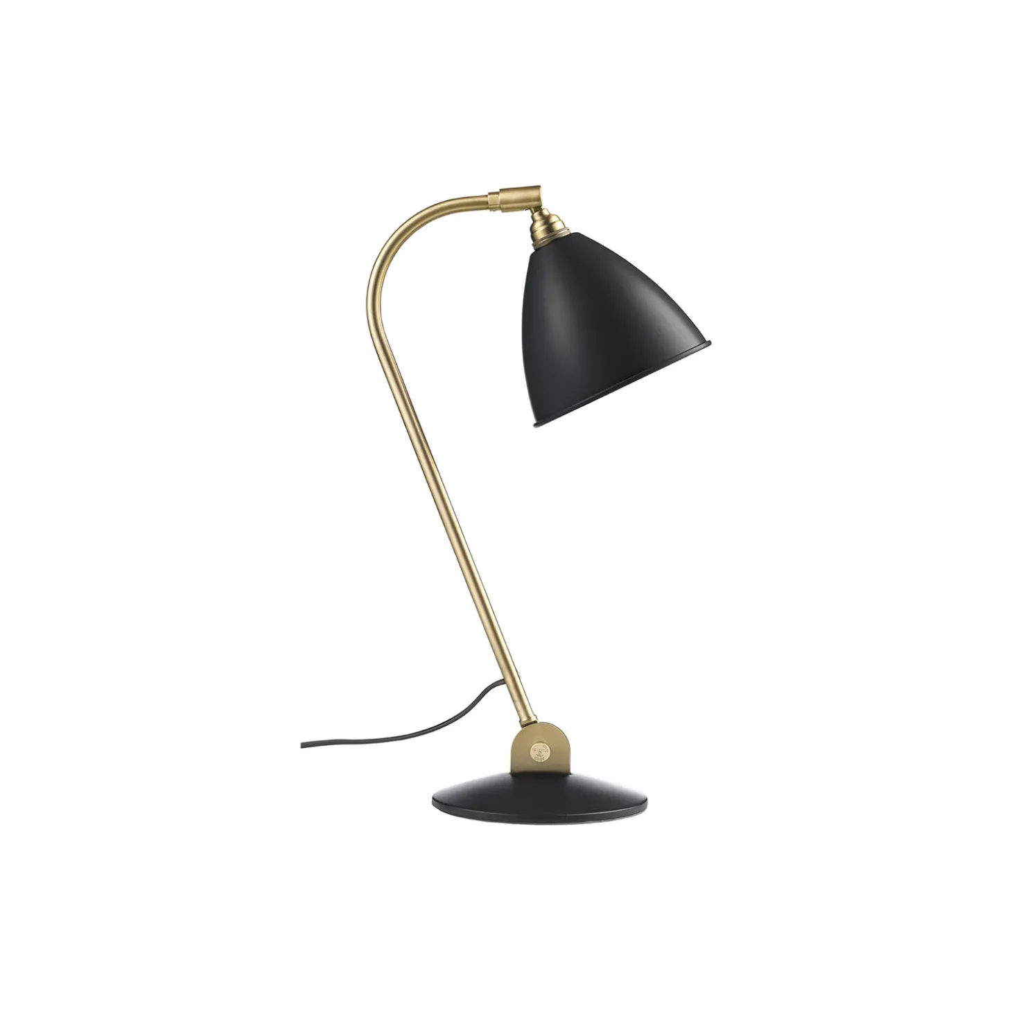Bestlite BL2 Table Lamp med skærm og base i pulverlakeret aluminium, arm i messing samt ledning i stof fra GUBI. Farve: soft black semi matt/brass. Mål: H: 48 x Ø 17,5 x Ø 16 cm. Lyskilde: 4-6W LED E14. Design: Robert Dudley Best.