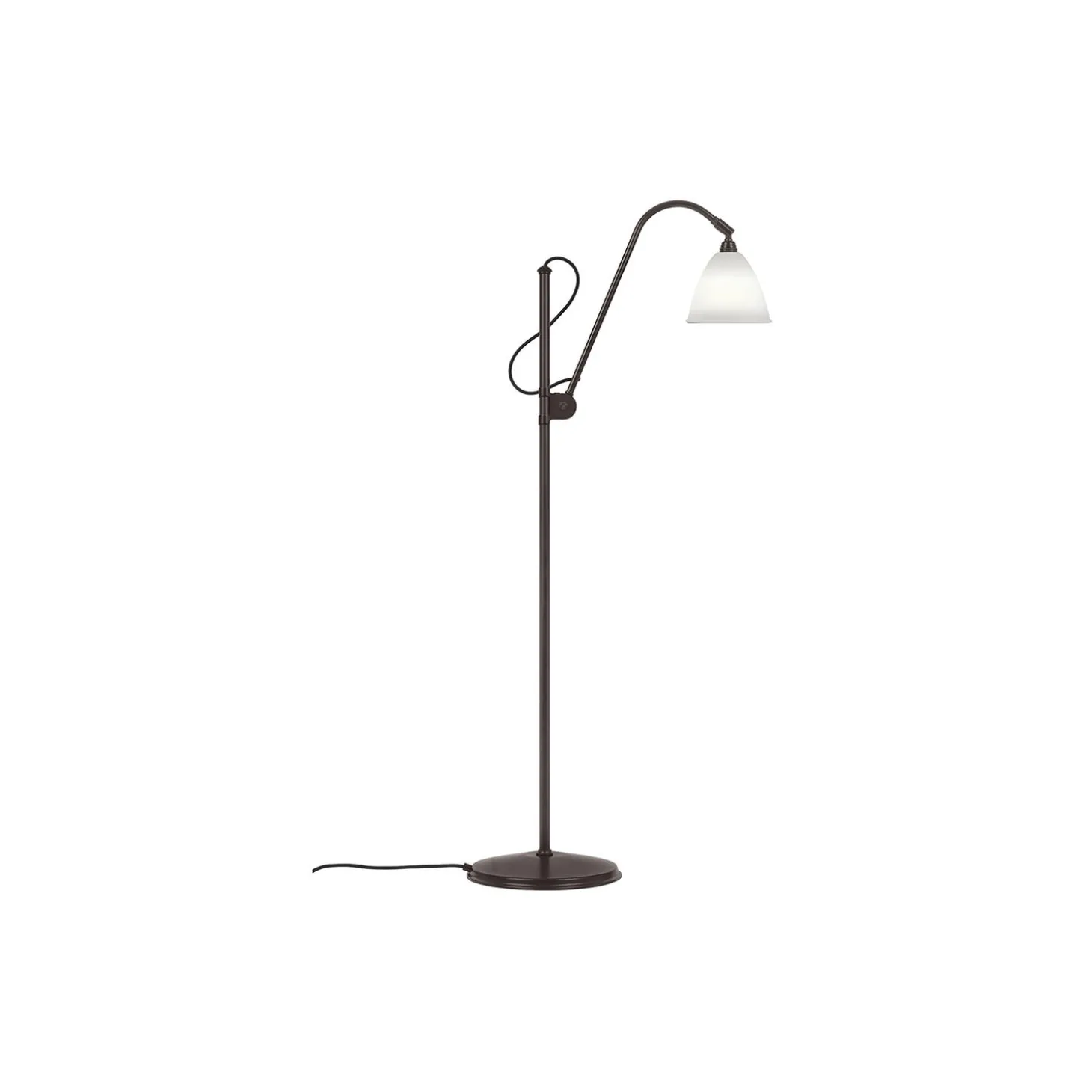 Bestlite BL3 S Floor Lamp med skærm i benporcelæn, base og arm i bruneret messing samt ledning i stof fra GUBI. Farve: bone china/black brass. Mål: H: 112-151 x Ø 28 x Ø 16 cm. Lyskilde: 4-6W LED E14. Design: Robert Dudley Best.