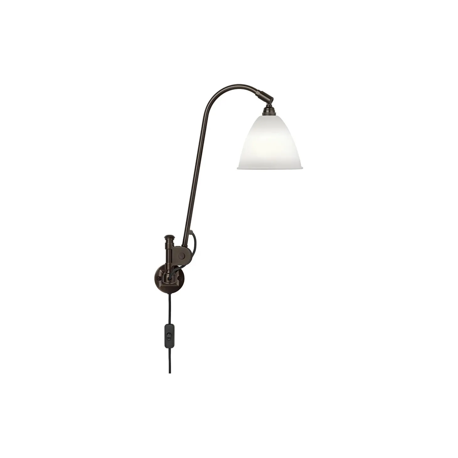 - Materiale: skærm i benporcelæn, vægbeslag og arm i sortoxideret messing samt ledning i stof