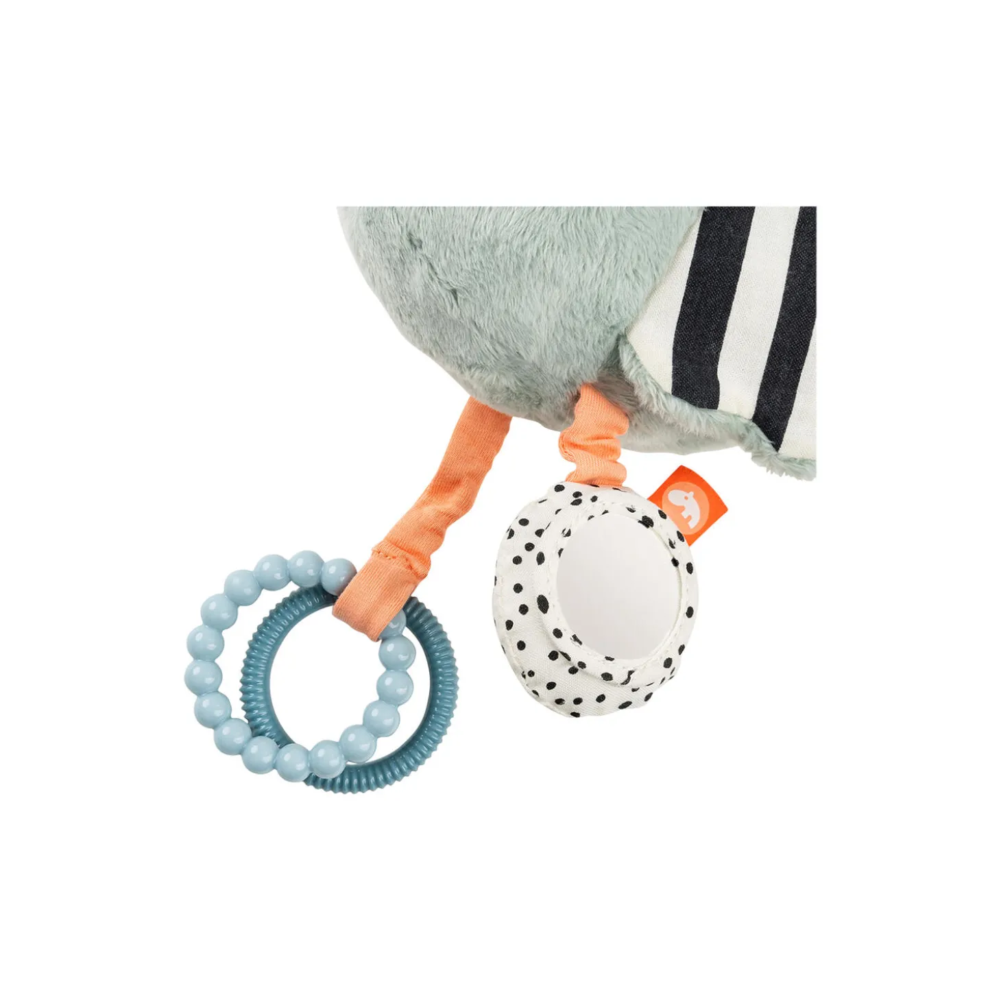• Birdee aktivitets- og sanselegetøj er fyldt med stimulerende funktioner • Anbefales fra 0+ måneder – perfekt til at fremme din nyfødtes syn, lade dit barn udforske alle funktionerne under mavetid, og ideel når dit barn kan sidde op • Sjove farver og klare kontraster giver visuel stimulering • Farverige mærker som små fingre kan udforske • Den ene vinge har sensoriske perler, der stimulerer din babys følesans, og den anden har knitre lyde, der stimulerer høresansen • Den ene fod har et spejl, der vækker dit barns nysgerrighed, og den anden har ringe som kan trækkes i for at få Birdee til at vibrere, så barnet lærer årsag og virkning