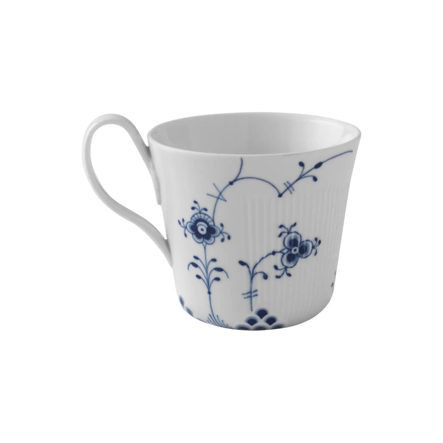Blå Elements højhankskop i porcelæn fra Royal Copenhagen. Blå Elements Højhankskop på 35 cl fremstår med en uhøjtidelig elegance, der passer ind i enhver samling af Royal Copenhagen. Koppen er håndmalet med et legende mønster af florale elementer, som er inspireret af det musselmalede mønster, mens et geometrisk felt af rifler og blåmalede fiskeskælsdekorationer skaber en overraskende balancegang mellem det klassiske og kontemporære. Den smukke kop er en sikker favorit til alle dagens kaffepauser eller testunder.