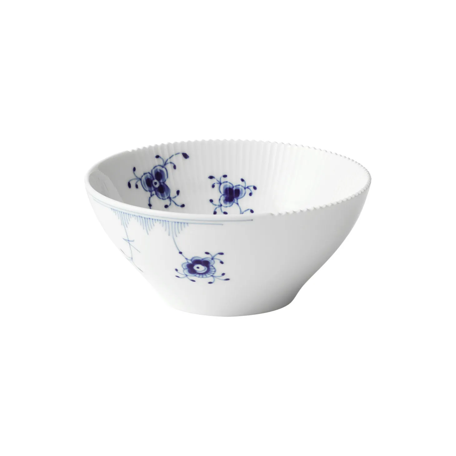 Blå Elements skål i porcelæn fra Royal Copenhagen. Den lille Blå Elements Skål på 30 cl er perfekt til en morgenmad med friske bær eller nyttig som en serveringsskål. Det livlige, håndmalede mønster pryder en overraskende kombination af klassiske Royal Copenhagen elementer som rifler og Flora Danicas ikoniske, takkede kant, der skaber en helt særlig borddækning.