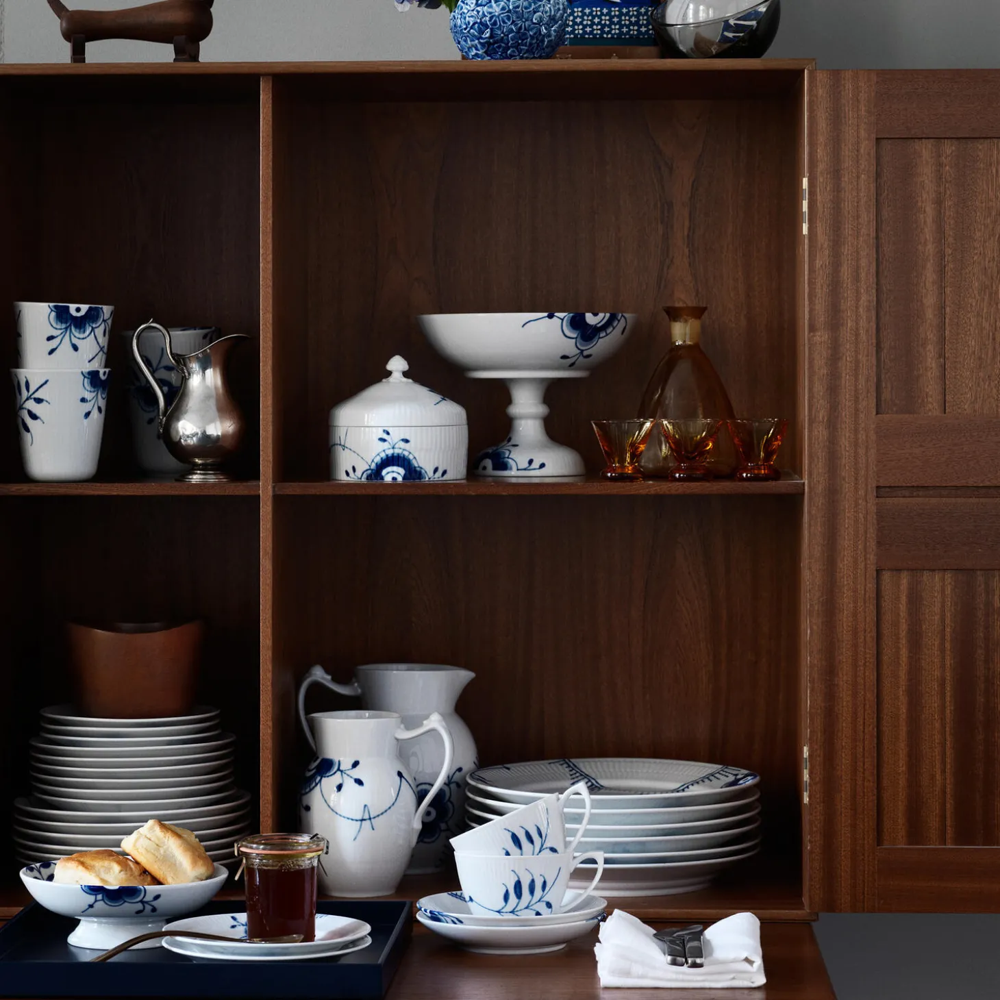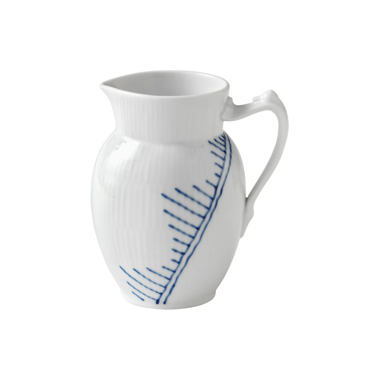 Blå Mega Riflet kande i porcelæn fra Royal Copenhagen. Denne charmerende Blå Mega Riflet Kande på 38 cl er håndmalet med udvalgte, forstørrede elementer fra det oprindelige musselmalede mønster, som pryder de håndlavede rifler. Kanden er ideel som flødekande eller mælkekande, og den vil også være en smuk kande til vinaigrette.