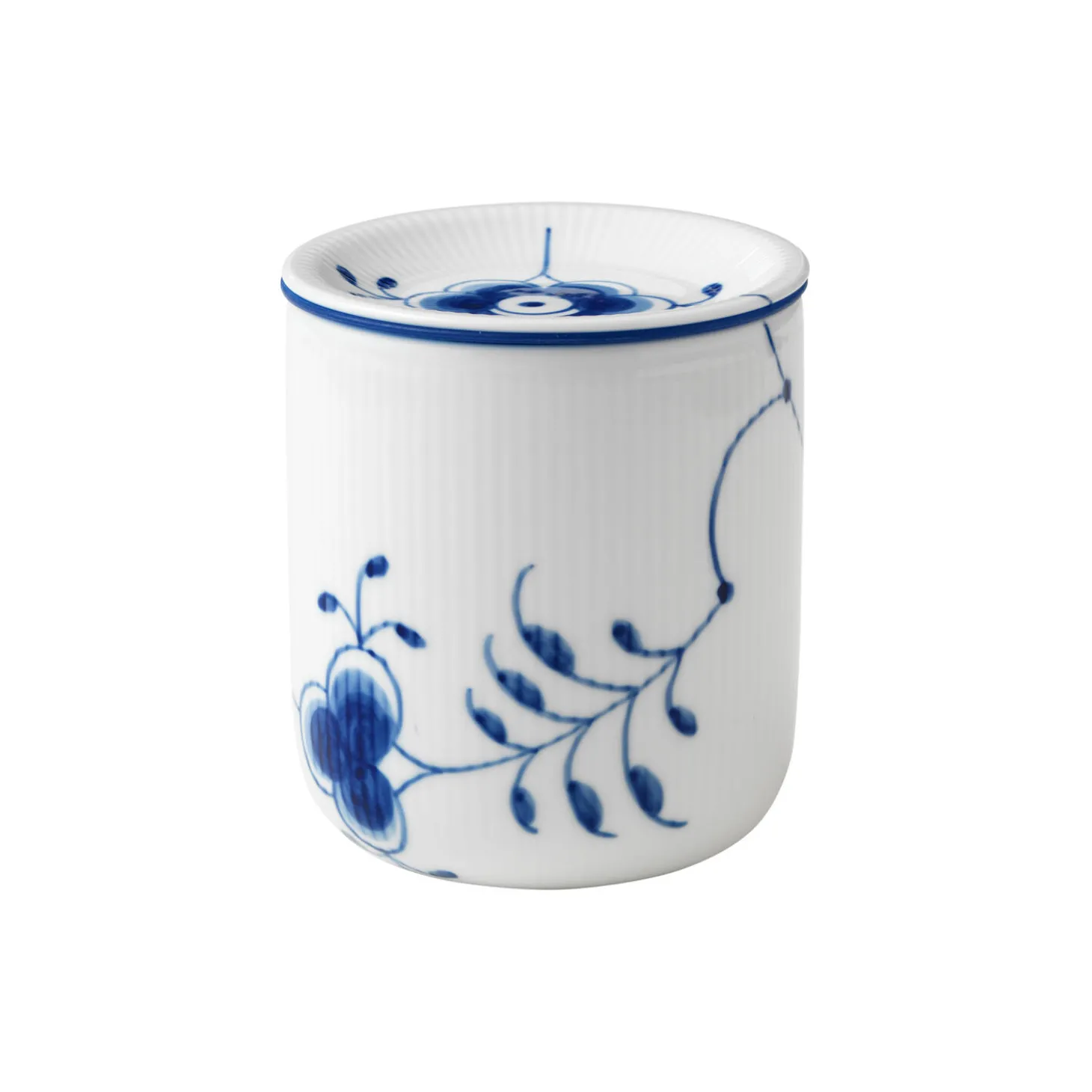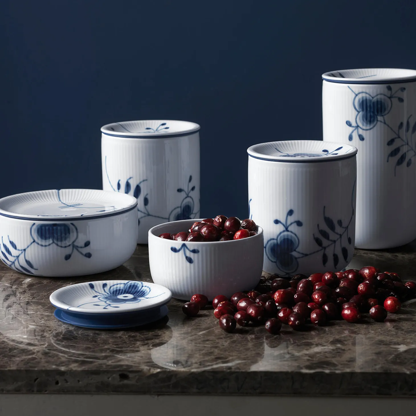 Blå Mega Riflet opbevaringskrukke i porcelæn fra Royal Copenhagen. En stiliseret krysantemum pryder låget, mens en håndmalet nøddeblomst og palmetter omkranser den smukke Blå Mega Riflet Opbevaringsrukke med låg på 80 cl. Den blå silikonekant i låget holder krukken lufttæt og er samtidig en kærlig hilsen til Blå Mega Riflets inspirationskilde, det musselmalede mønster.