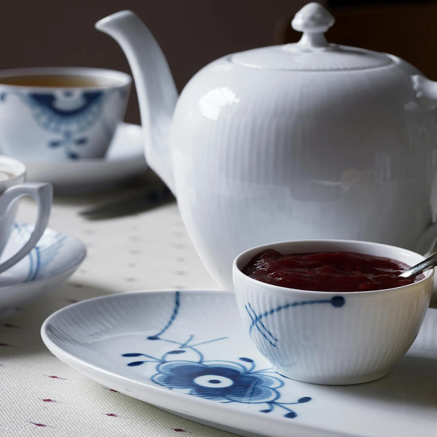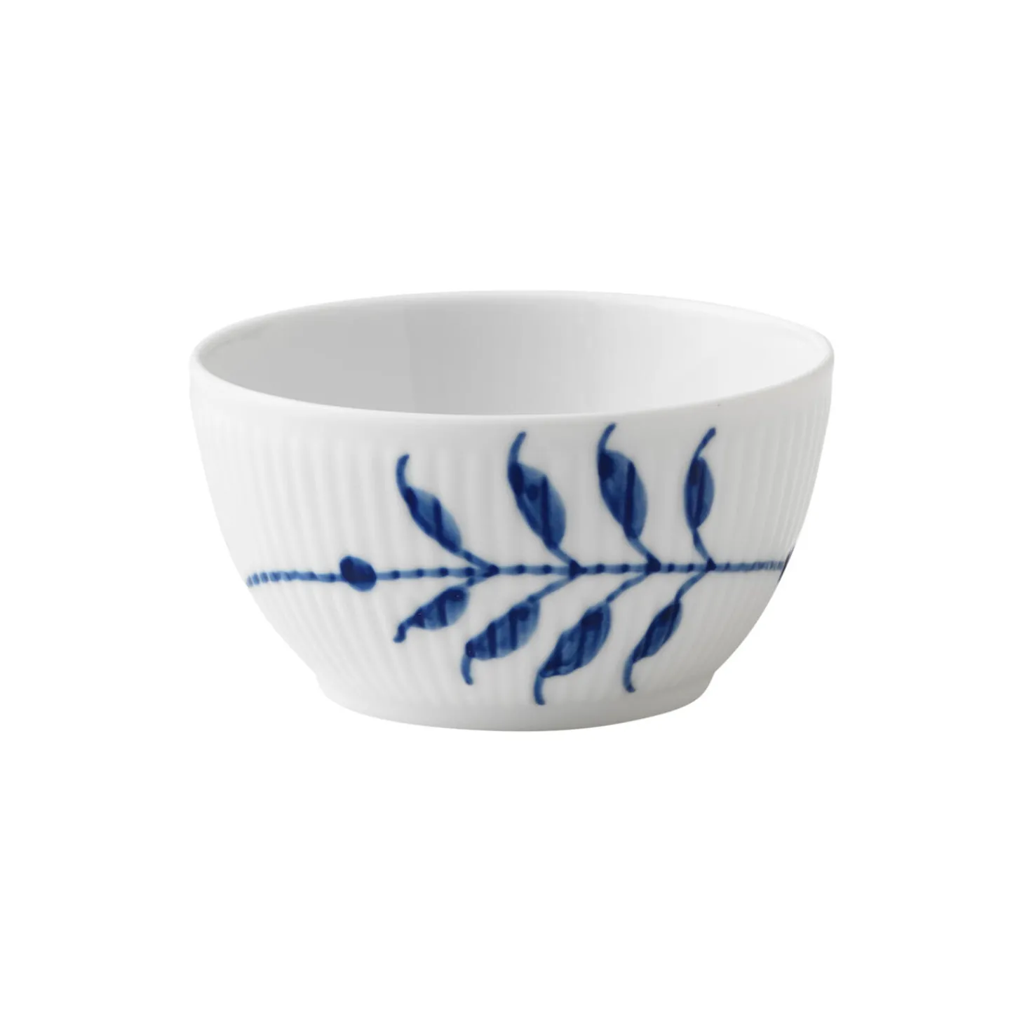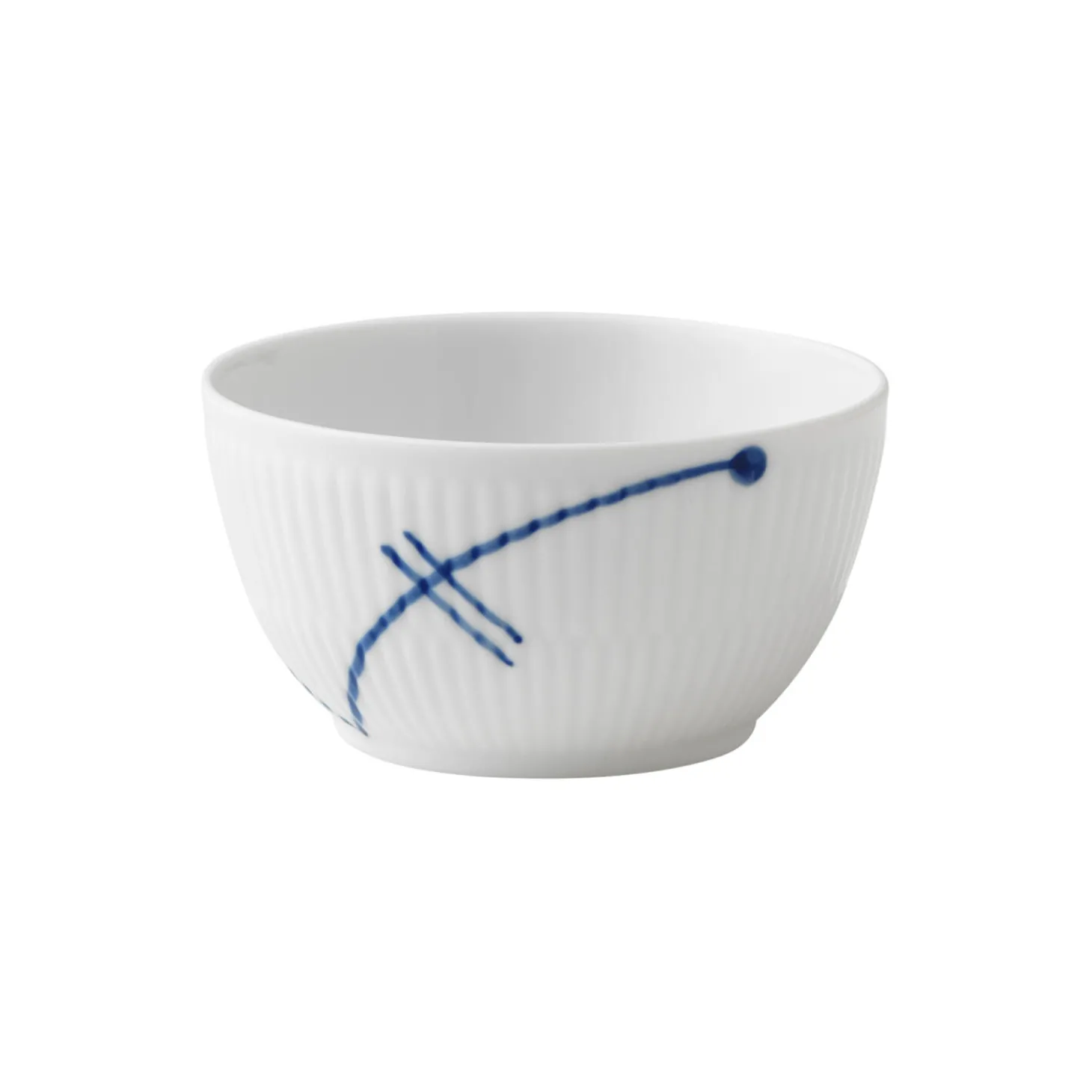 Blå Mega Riflet skål i porcelæn fra Royal Copenhagen. Denne lille Blå Mega Riflet Skål på 15 cl prydes af en håndmalet, forstørret palmette, som gennemskæres af en linje, der løber rundt om skålen og skaber et overraskende udtryk. Skålen kan bruges som snackskål eller til opbevaring af små ejendele.