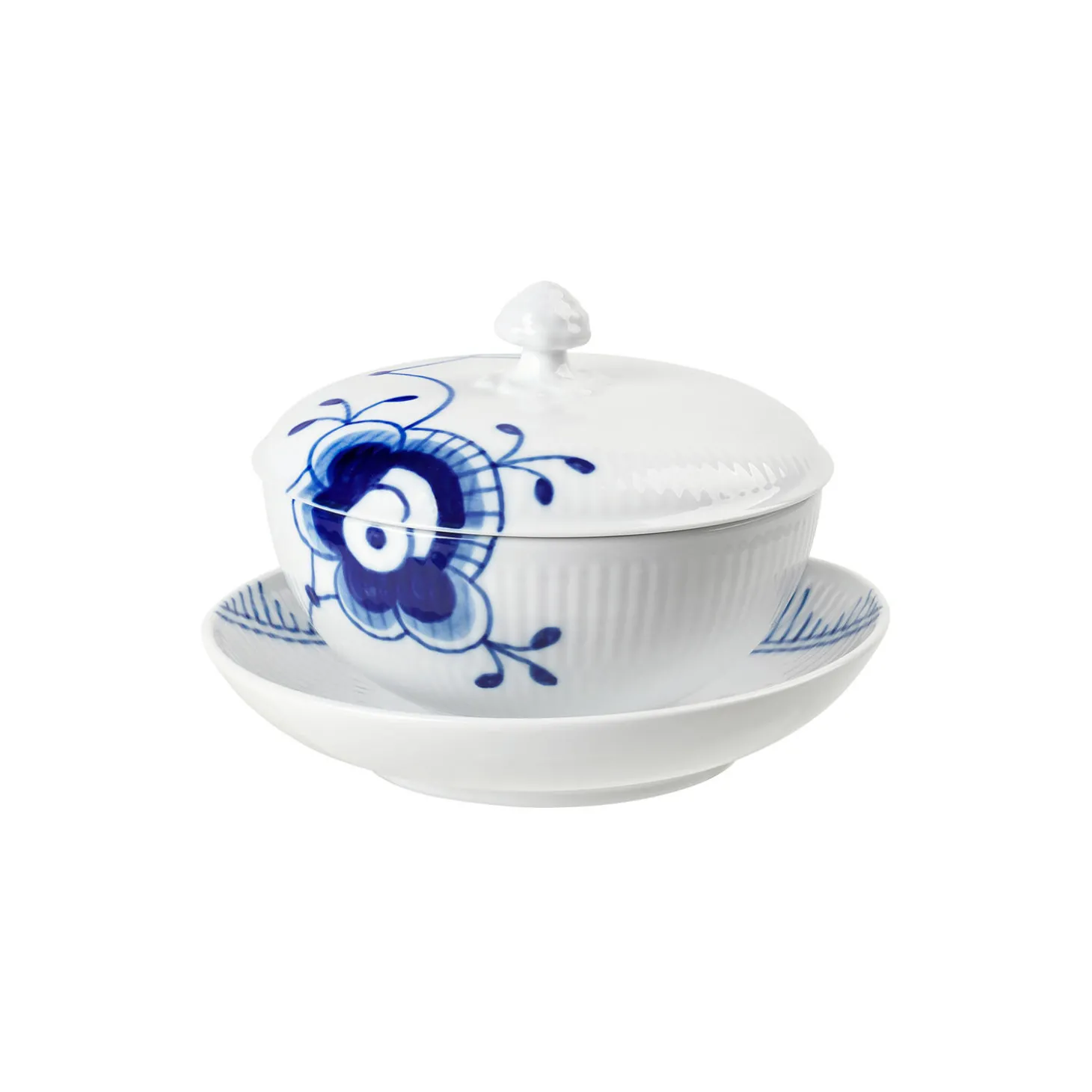 Den Blå Mega Riflet skål med låg og underkop fås i ét praktisk sæt. Ideel til en mindre portion suppe eller andre små retter. Med den håndmalede dekorationer, der organisk pryder skål og låg er dette tredelte stykke porcelæn en særlig tilføjelse til den Blå Mega Riflet kollektion.