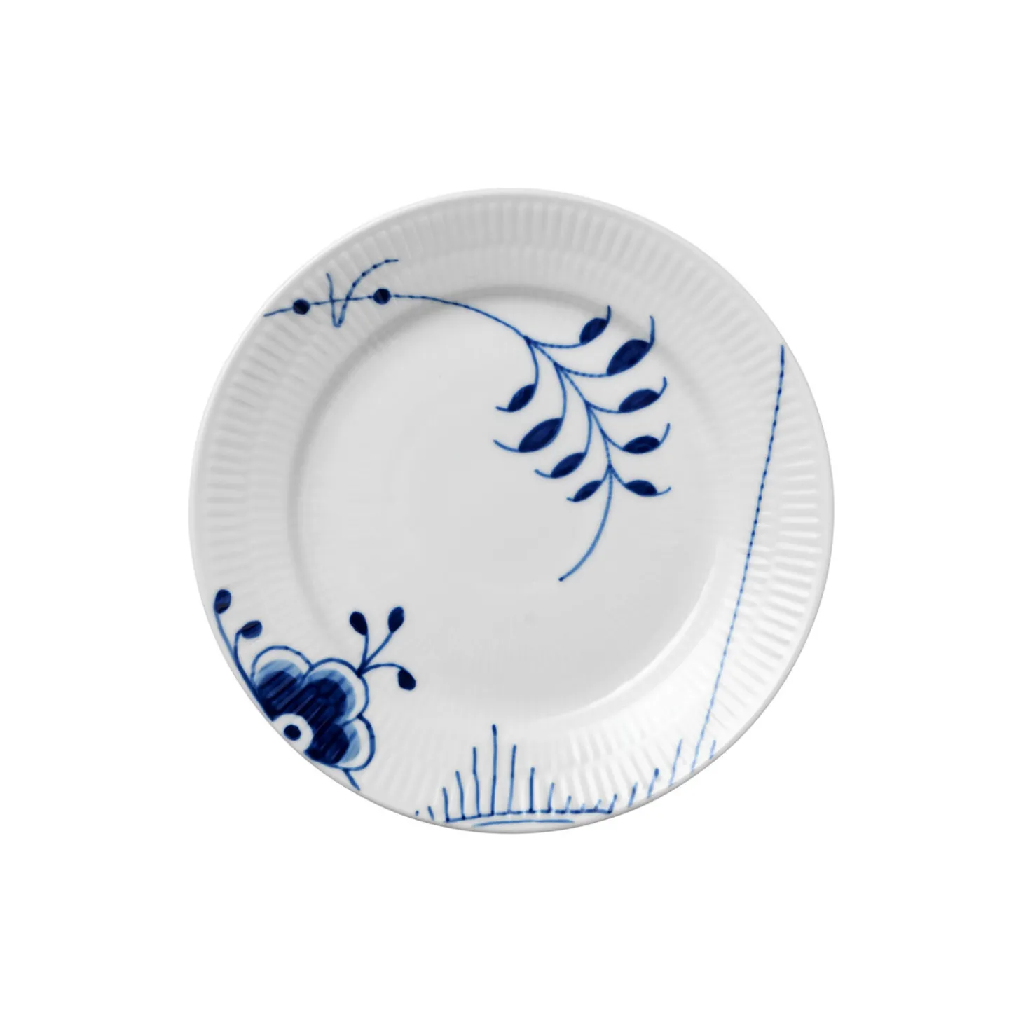 Blå Mega Riflet desserttallerken i porcelæn fra Royal Copenhagen. Dekoration #2. Farve: hvid/blå. Mål: Ø 19 cm. Design: Karen Kjældgård-Larsen.