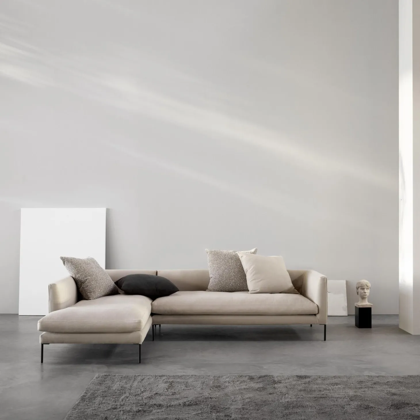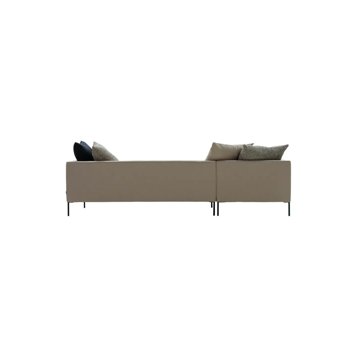 Sofaen har et moderne udtryk med de rene linjer og sorte stålben. Udtrykket blødes op af de 6 løse rygpuder i forskellige tekstiler og farver.