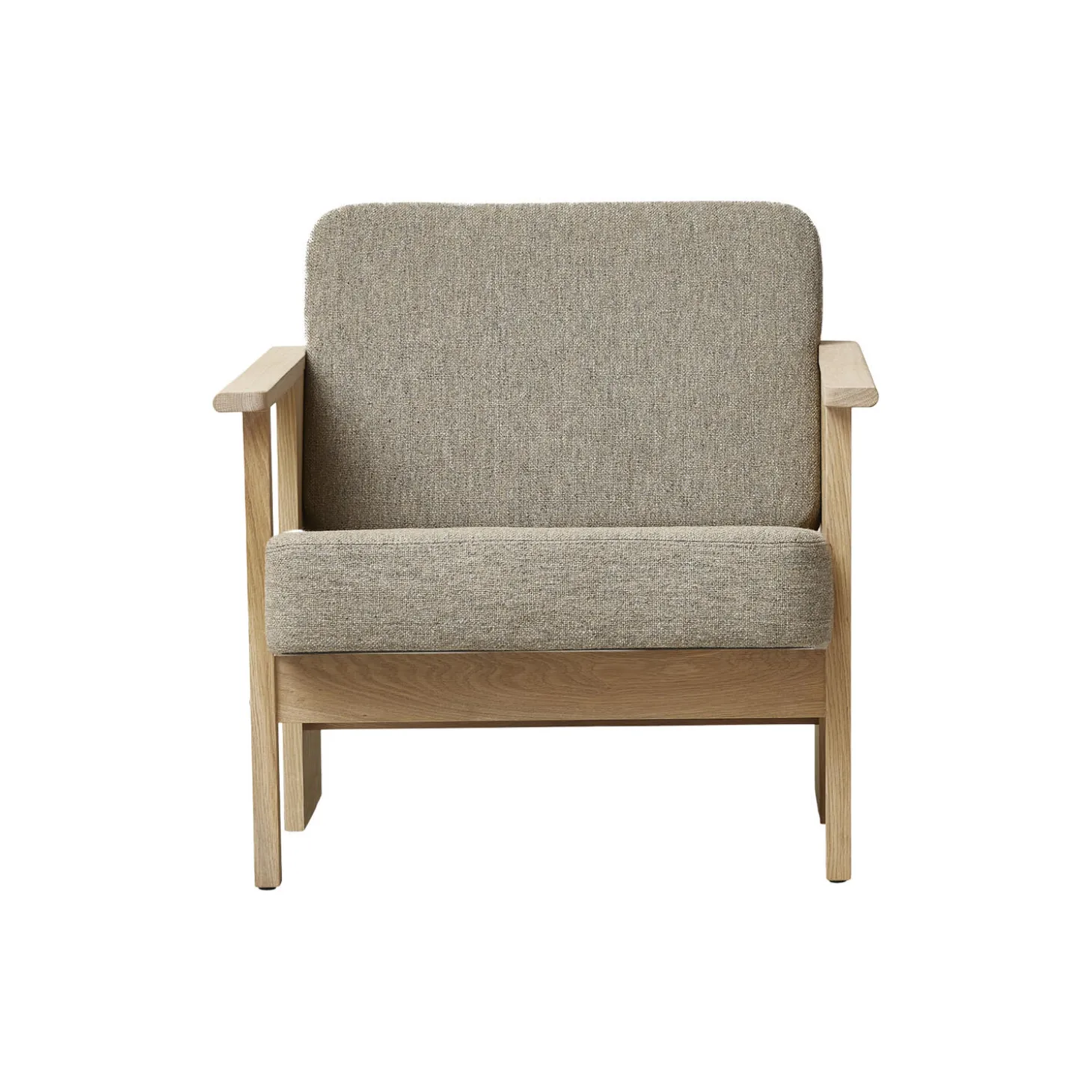 En kompakt polstret lænestol med et markantsidepanel i træ og delikat tekstilbetræk, som kombinerer rene, slidstærke materialer og bløde ergonomiske former. Stolen er tænkt som et fleksibelt møbel med generøs siddekomfort trods sinminimale størrelse.Det udsøgte tekstil har synlige syninger på for- og bagkanten af sædet. Block Lounge Chair er velegnet til både smålokaler og store, åbne rum. Hallingdal-tekstilettilfører den kubiske Block Lounge Chair god komfort og stoflighed.Den polstrede siddehynde er tæt indpasset i stolen med blødt afrundede kanter.Tekstilet Hallingdal 65, 0227, er udviklet i partnerskab med Kvadrat.