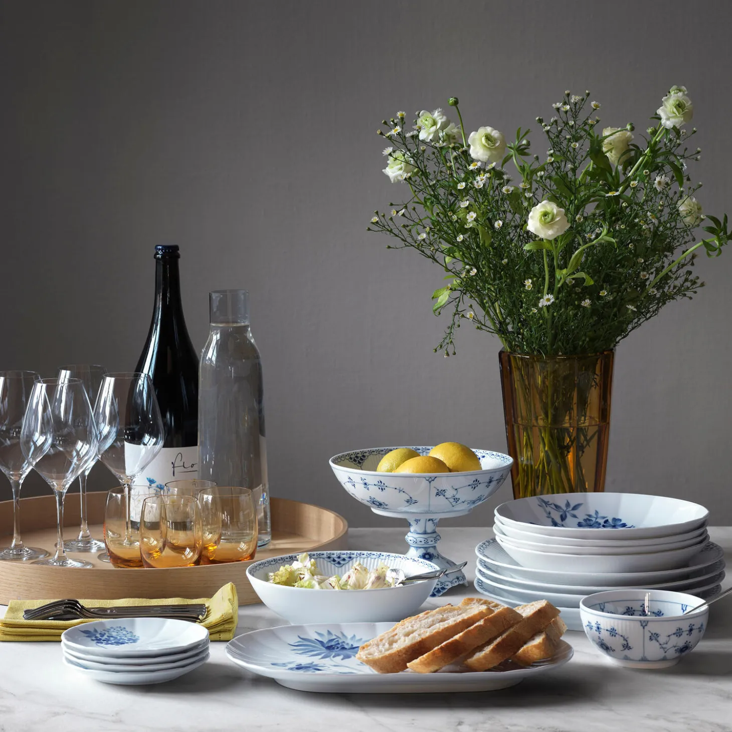Blomst fad i håndmalet porcelæn med dahlia motiv fra Royal Copenhagen. Det store blomst Fad på 34 cm har geometriske vinkler, som åbner sig op som en vifte og afslører den håndmalede dahlia, der i al sin pragt blomstrer på det hvide porcelæn. Det ovale fad skaber en særlig bordækning som et serveringsfad til store og små retter.