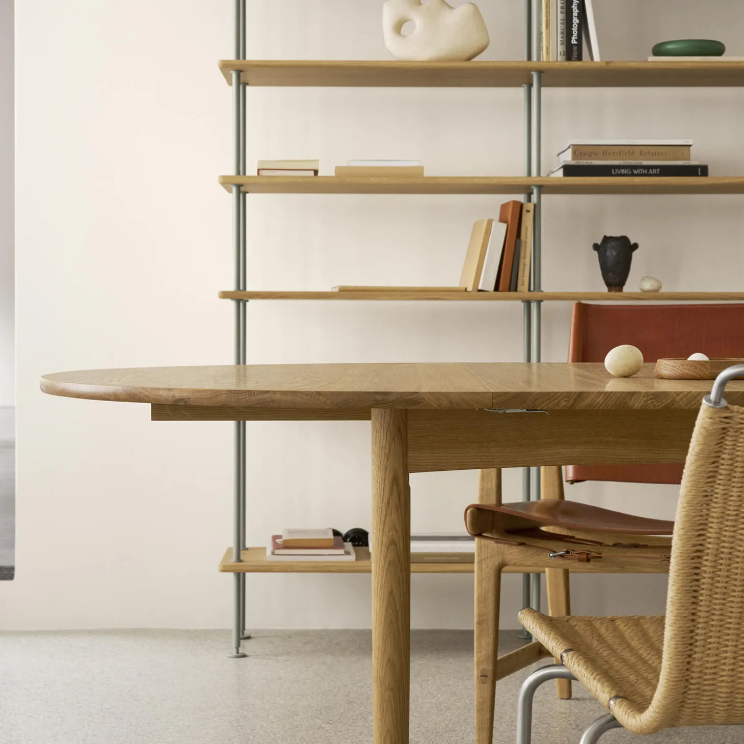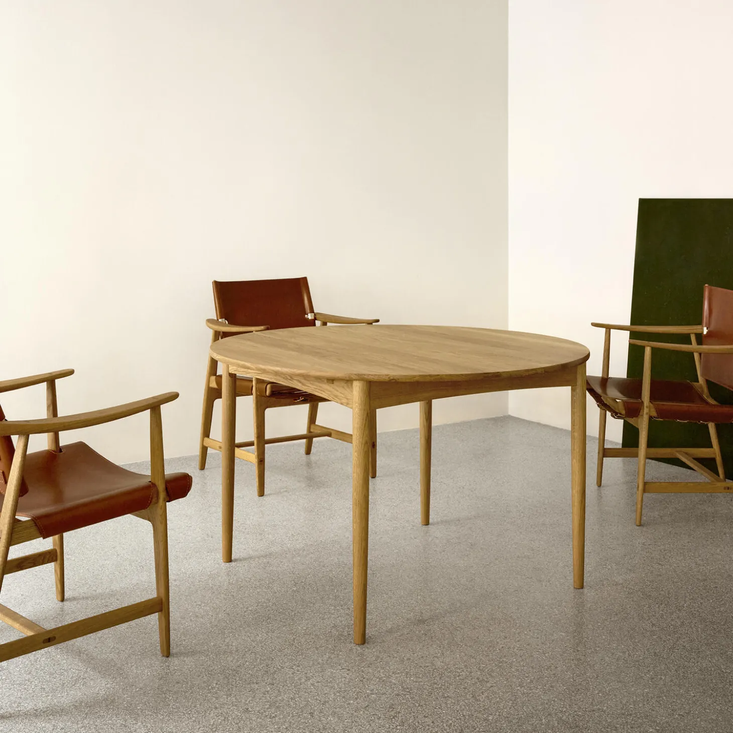 Børge Mogensen designede BM0121 Spisebord i 1952 som en spisebordsløsning til mindre boliger. Bordet, der har plads til 4-6 personer, er det første runde udtræksbord fra Børge Mogensen i Carl Hansen & Søns kollektion. Det er udført i FSC®-certificeret massivt egetræ og har med sin 19 mm slanke bordplade, de diskret tilspidsede ben og den opadbuede sarg et let visuelt udtryk. Bordet kan forlænges med en ilægsplade i eg eller MDF.