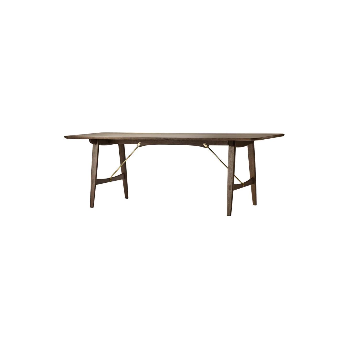 BM1160 Jagtbordet spisebord med bordplade i olieret valnøddetræsfinér, kantprofil og stel i olieret valnød med tværstænger i messing fra Carl Hansen & Søn. Farve: olieret valnød/messing. Mål: H: 72 x L: 210 x B: 82 cm. Design: Børge Mogensen.