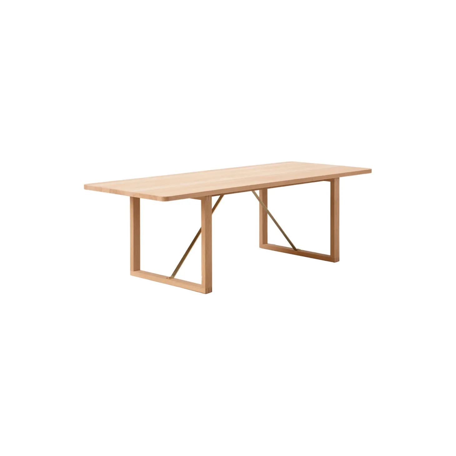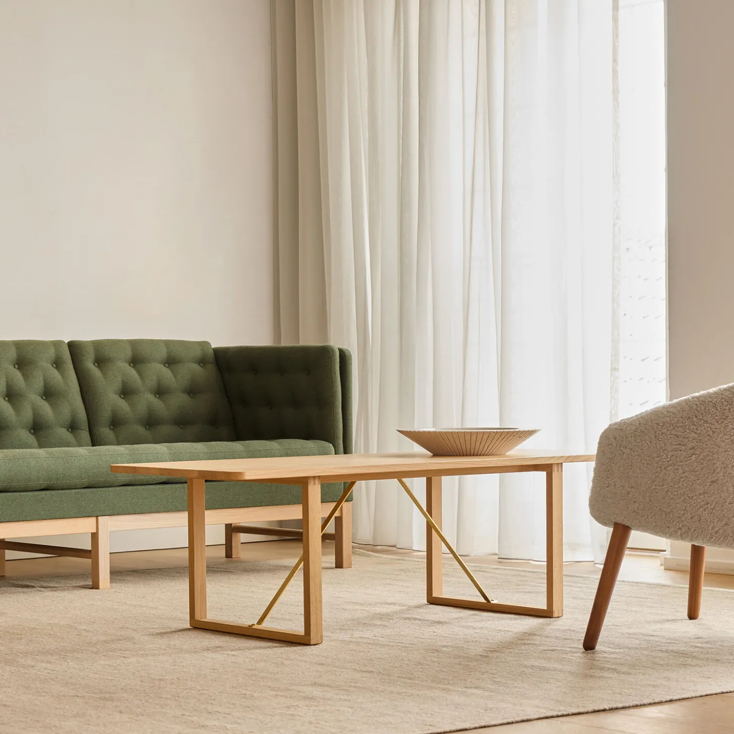 BM67 sofabordet, designet af Børge Mogensen i 1956, kombinerer massivt træ og messingstivere med en enkel, rektangulær base. Det minimalistiske design fremhæver materialernes naturlige skønhed, hvor messing vil patinere smukt over tid. Tro mod Mogensens filosofi om funktionalitet og ærlige materialer, tilfører BM67 tidløs elegance til enhver moderne stue, lounge eller hotellobby