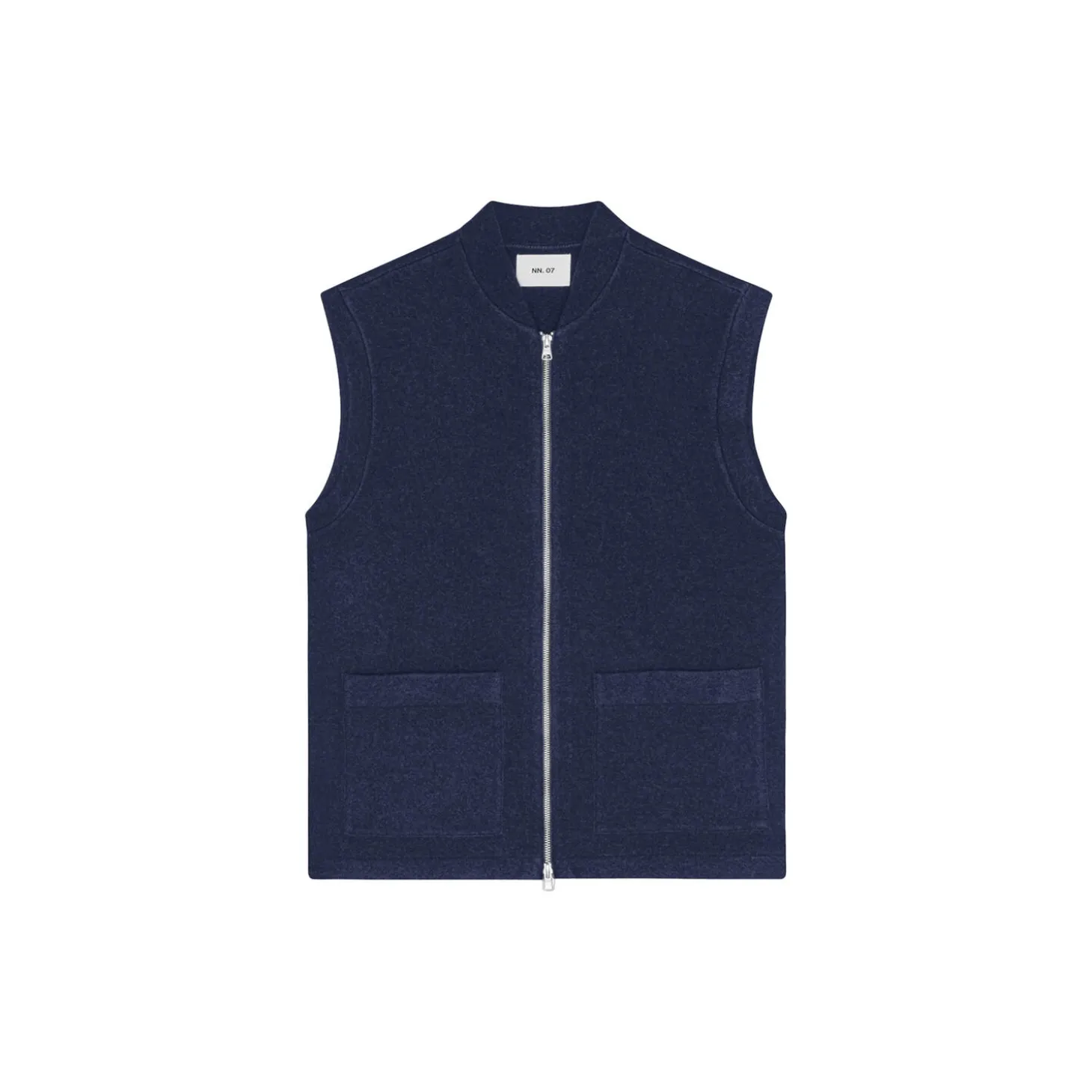 A zip-up vest crafted in soft boiled merino wool. Features a minimalist bomber collar complete with square twin pockets.