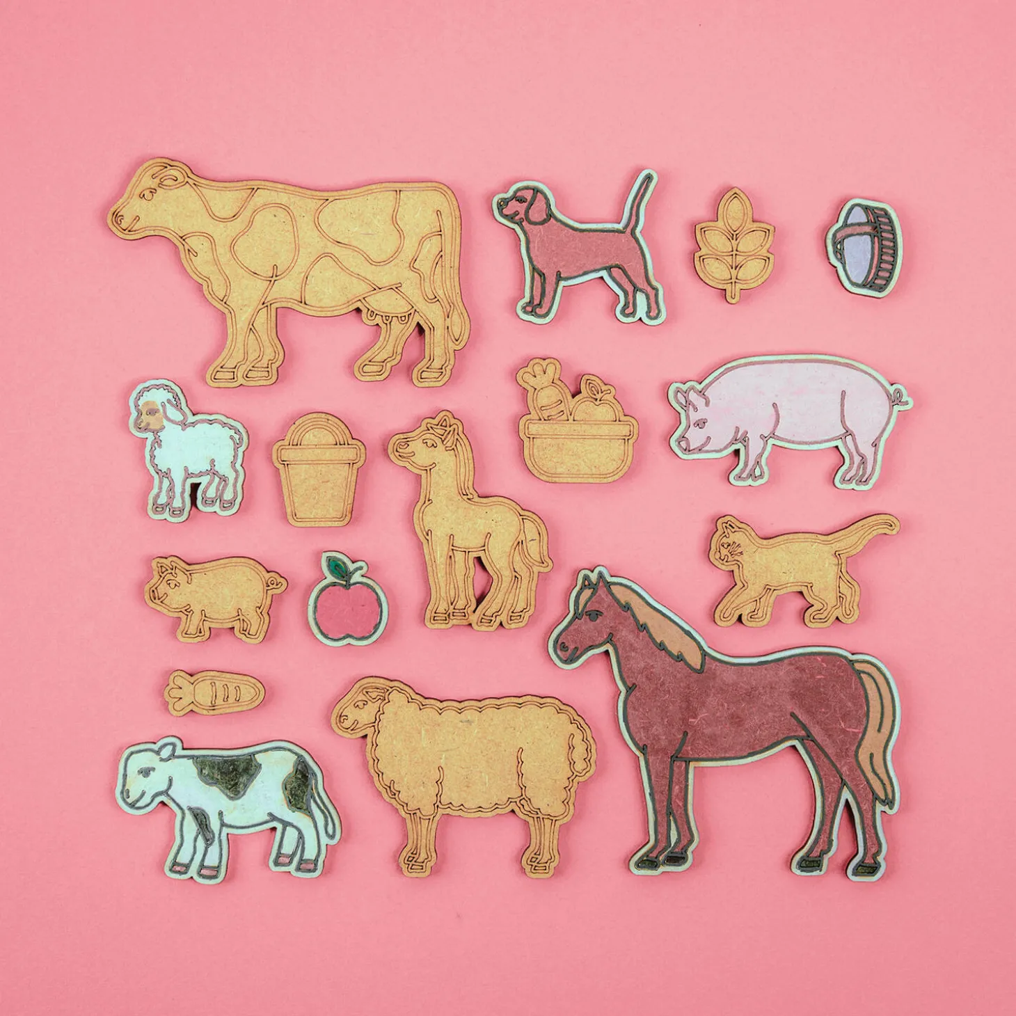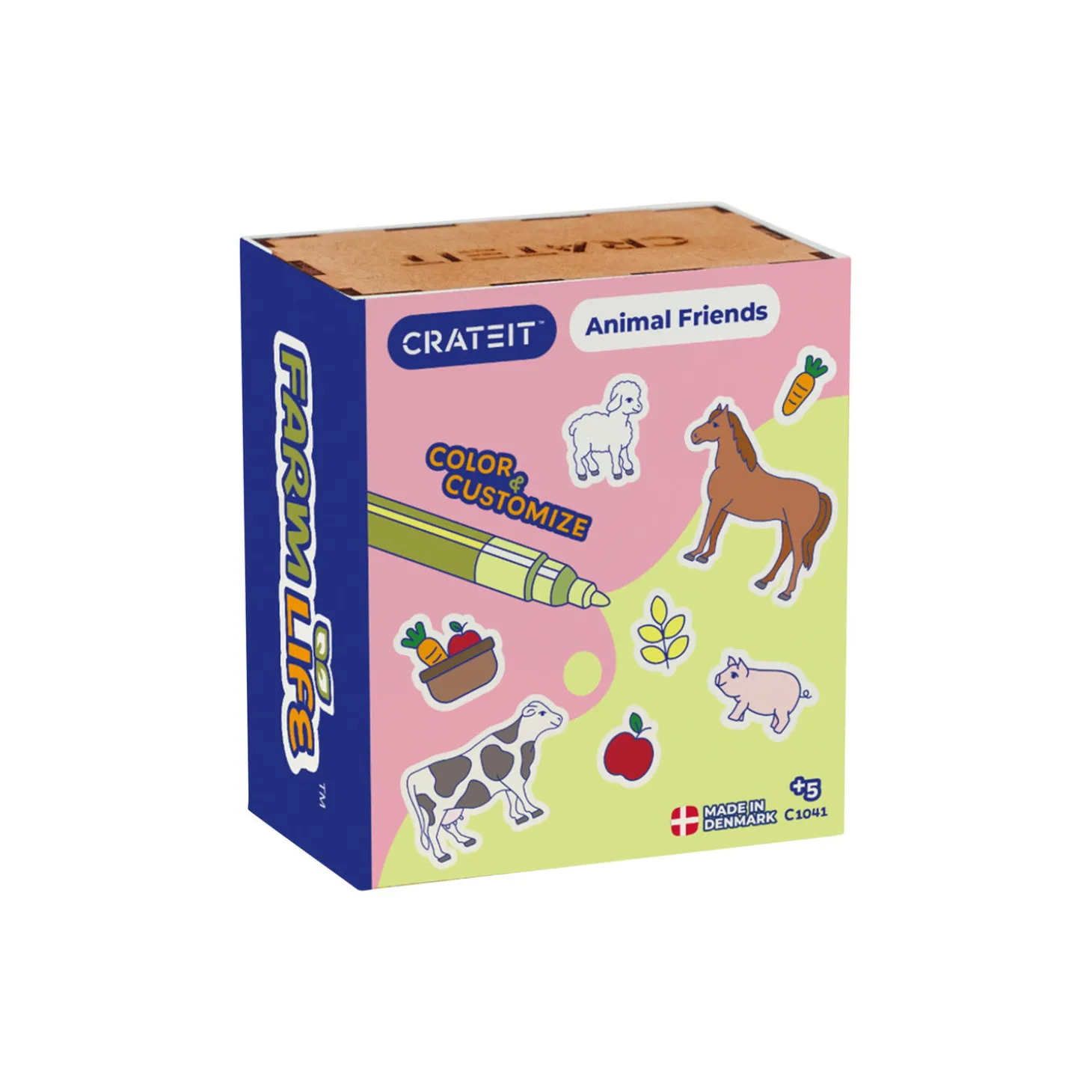 Crateit Animal Friends er en del af vores populære Farmlife-serie og giver dine børn mulighed for at udforske livet på gården gennem kreativ leg. Dette trælegetøj er perfekt til børn, der elsker dyr og vil have det sjovt med at farvelægge og personliggøre deres egne dyrevenner. Specifikationer: Produceret i Danmark. Antal figurer/dele: 15 figurer. Varenummer: C1041. Størrelse på pakken: 10.5x12x6.5 cm. Figurerne er ca. 7-10 cm høje. Vægt: 250 g. Alle vores produkter er produceret i træ uden farve. Det skal du påføre selv. Kan farvelægges med alle slags tuscher, maling og farveblyanter. Tuscher følger ikke med og kan købes ved siden af.