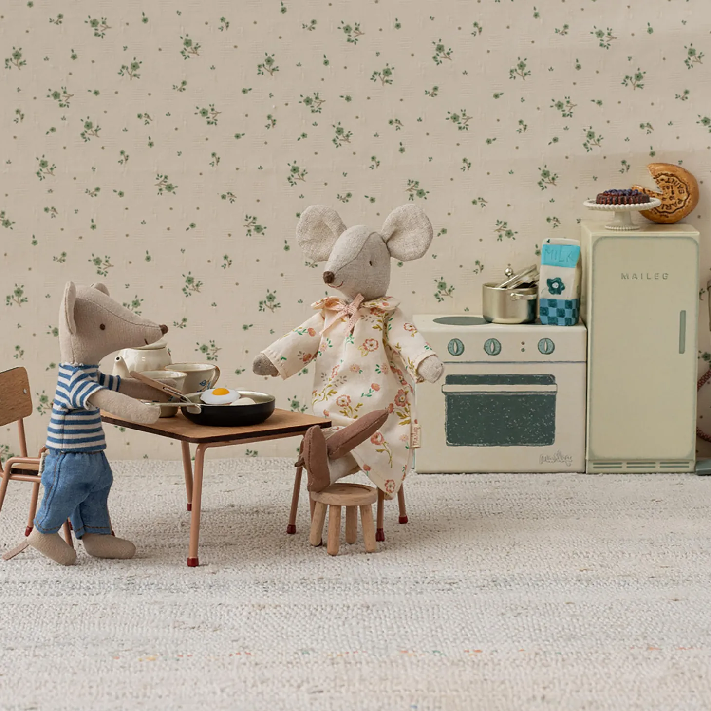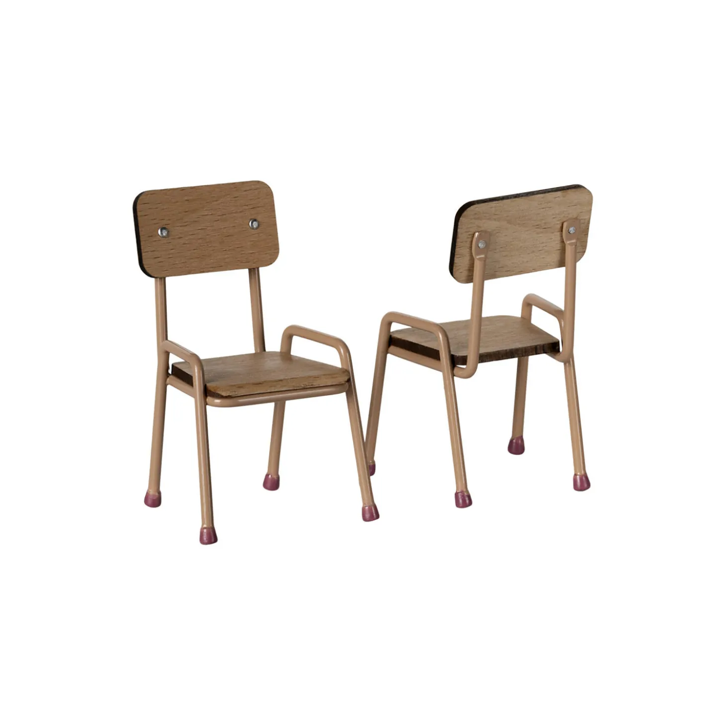 Sæt med bord og stole, der passer til Mouse hole Farmhouse. Sættet er lavet af bøgetræ med metalben. Bemærk de håndlavede farvedetaljer nederst på bord- og stolebenene. Sættet kommer med to stole.