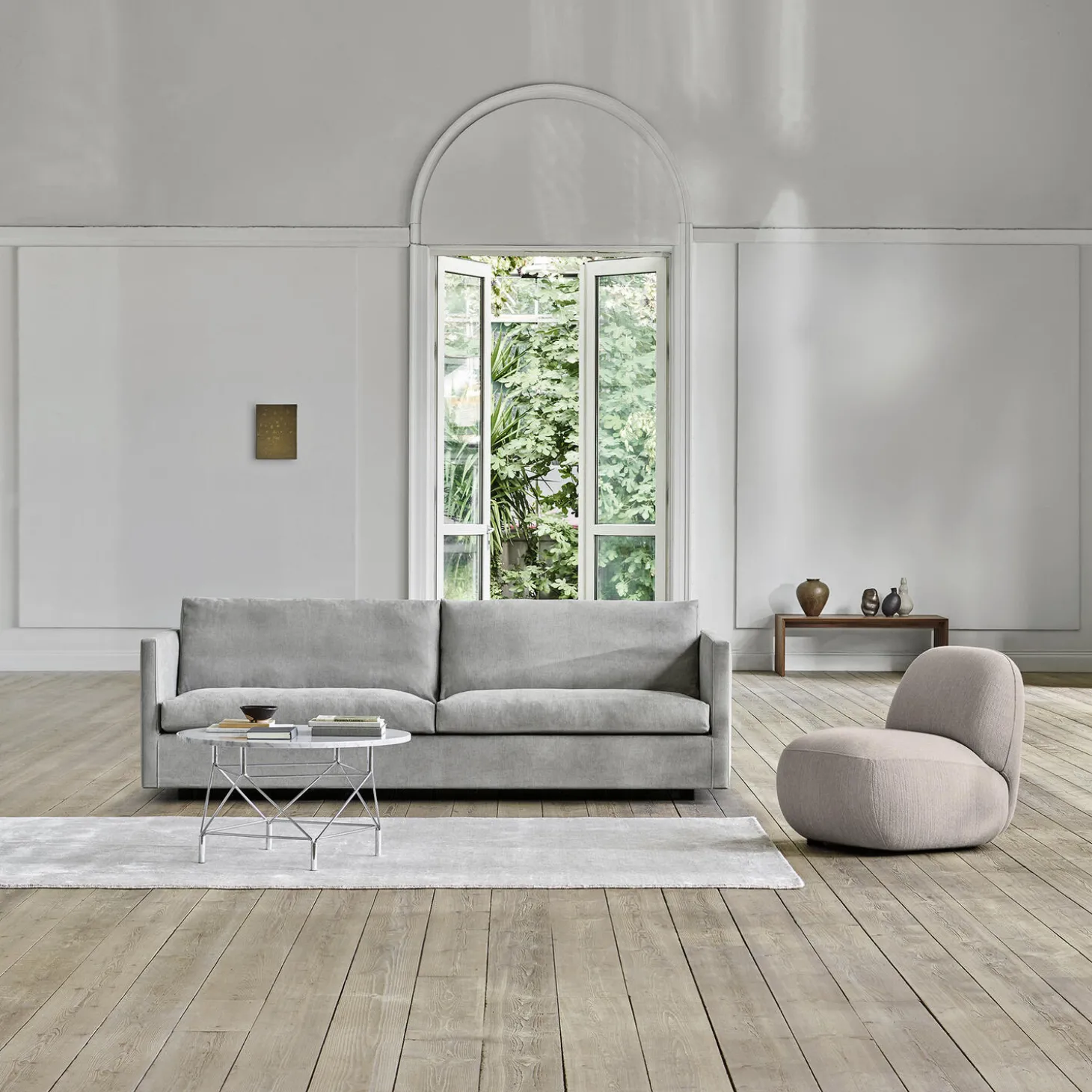 Med blot 5,5 cm har Box ultratynde armlæn, der proportionalt har givet mulighed for, at ryggen også er ekstra høj. Det optimerer siddestillingen og er samtidig en fræk kontrast til både sofaens muskuløse krop med kraftig rygpolstring – og til Eilersens duntopsæde, der med skumkerne svøbt i dun tilfører sofaen et blødt look. Rygpuderne er af 100% dun og giver sammen med duntopsædet den velkendte Eilersen komfort. Stel i massivtræ med sædeaffjedring af Nozag-fjedre, polstret med polyuretanskum.Pudefyldet i sæde er en duntop-pude, der består af en højelastisk polyuretanskumkerne med et svøb af 100% dun og andesmåfjer, indsyet i et kanalopdelt vår af duntæt cambric.Pudefyldet i ryg- og lændepuder er 100% dun og andesmåfjer.
