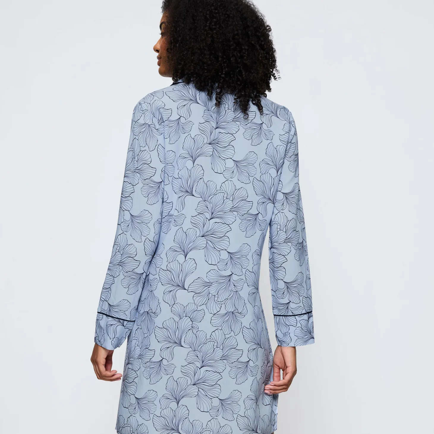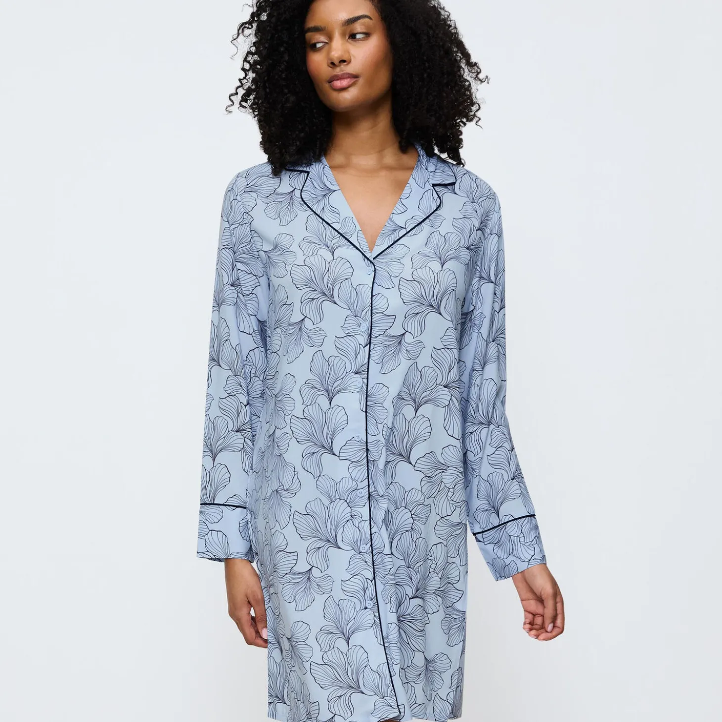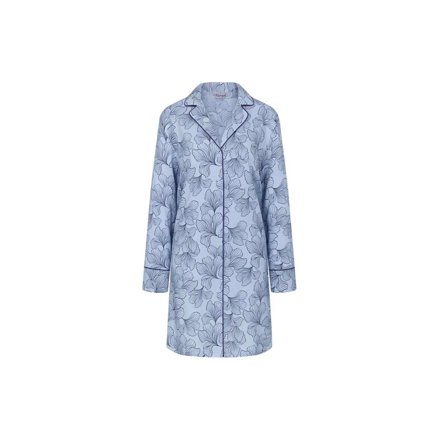 Langærmet Boyfriend-natkjole med afslappet pasform, klassisk krave og kontrastfarvede kantebånd. Designet med blødt, åndbart stof.