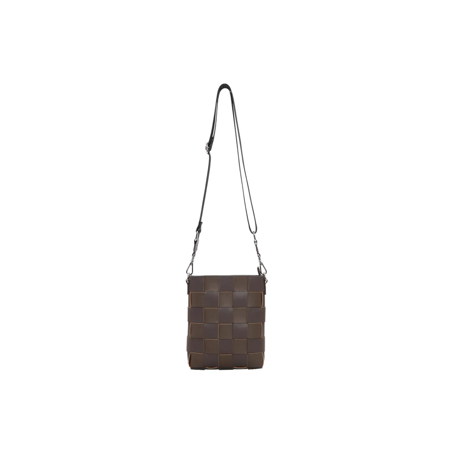 Small cross-body bag in a rectangular braided faux leather. The bag has one room with a zipper closure and has a wide adjustable logo strap that can be removed.