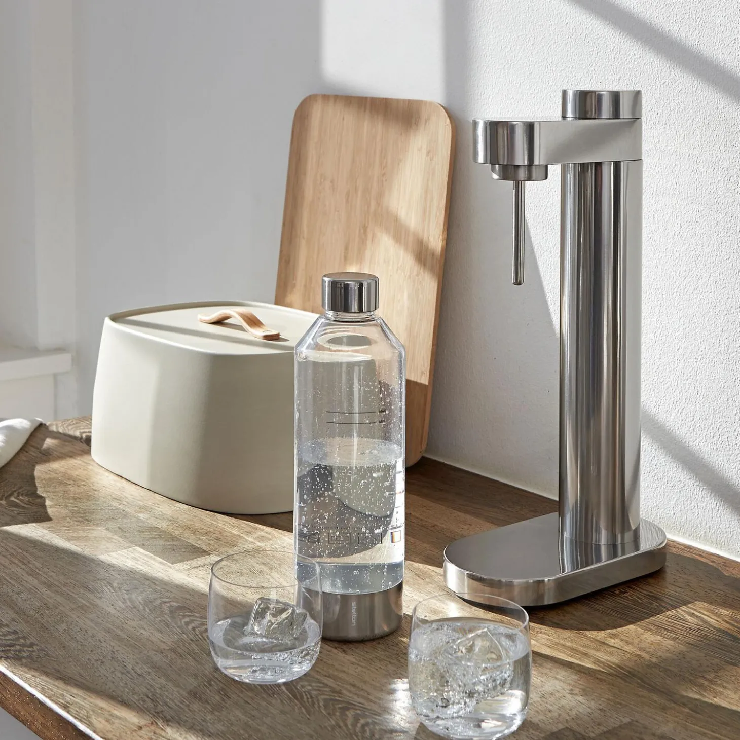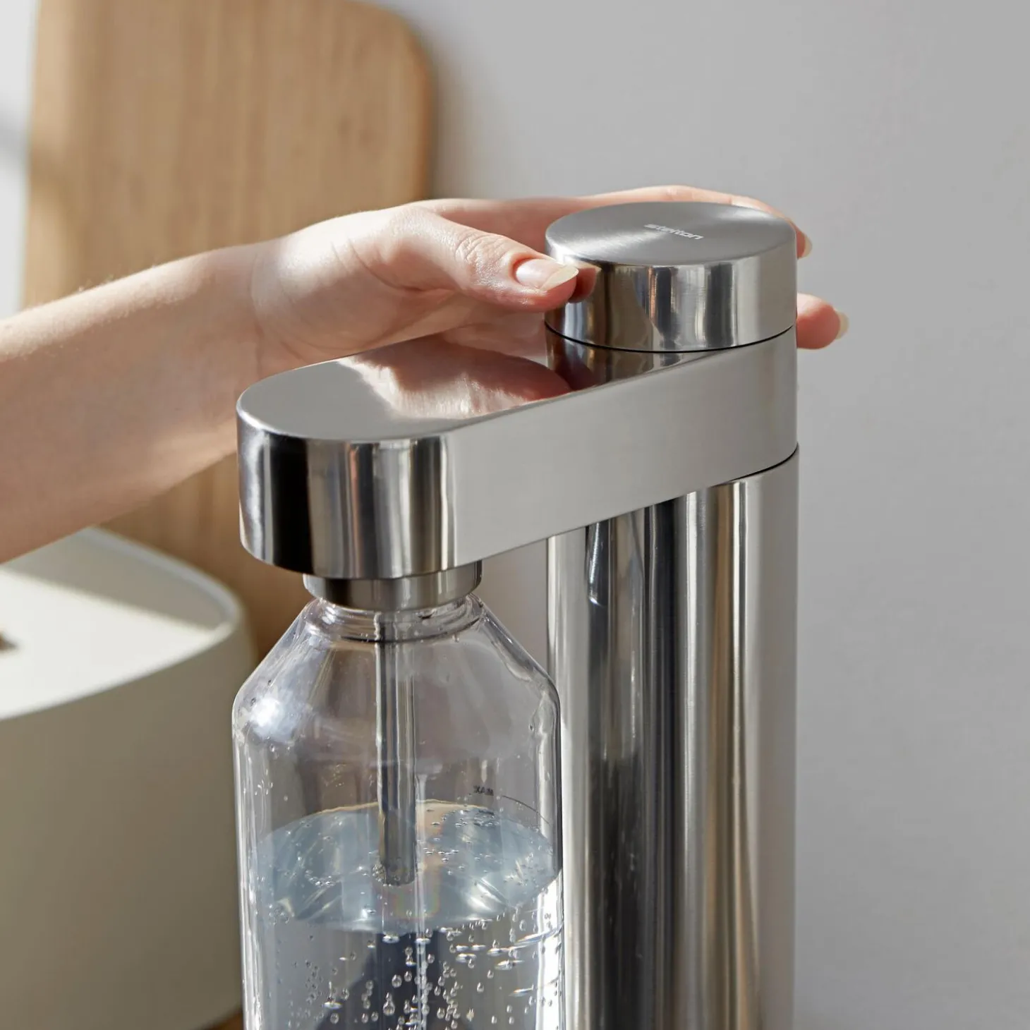 Med Brus kulsyremaskine sparer du miljøet for store mængder af unødigt plast ved at lave din egen danskvand eller sodavand i genanvendelige flasker. Designet af sodavandsmaskinen er så elegant, at du kan glæde dig over at have den stående fremme på køkkenbordet. Designeren bag, Søren Refsgaard er kendt for sit rene funktionelle design, hvor alt overflødigt er skåret væk. Det er Brus et særdeles godt eksempel på. Designet trækker på de cylindriske former, der er klassisk for Steltons design. Den cylindriske form ses først og fremmest i den ultraslanke beholder til kulsyrepatronen og går igen i kulsyreknappen, der intuitivt drejes med uret for at tilpasse mængden af kulsyre og drejes kontra, når flasken skal løsnes fra maskinen. Brus kulsyremaskine leveres med et styk Brus flaske.