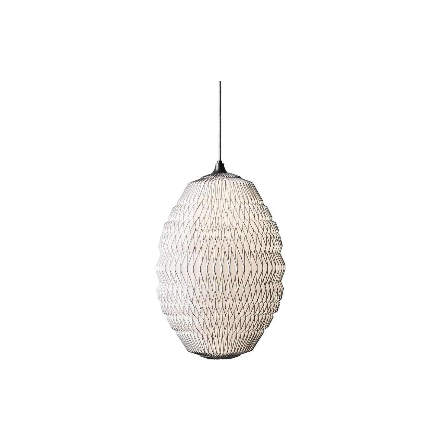 Caleo pendel i metal og papir fra LE KLINT. Farve: hvid. Mål: H: 68 x Ø 35. Lyskilde: maks. 20W E27. Design: Rikke Frost.
