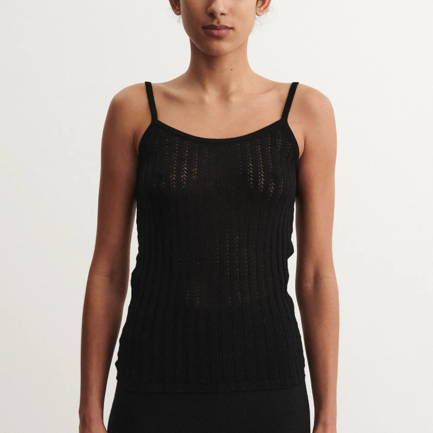 Denne undertrøje er strikket i ekstra fin merinould. Den har en tætsiddende pasform med smalle stropper og er strikket i et dekorativt rib-pointellemønster med ribkant. Vores merinould er BLUESIGN® og RWS-certificeret, fri for skadelig kemi og stammer fra får, der ikke er blevet udsat for mulesing. 100% OEKOTEX®, RWS og BLUESIGN® certificeret merinould. Garnet er behandlet med en miljøvenlig teknologi, som gør, at tøjet kan maskinvaskes på uldprogram. Behandlingen indeholder hverken klorin eller andre halogener.