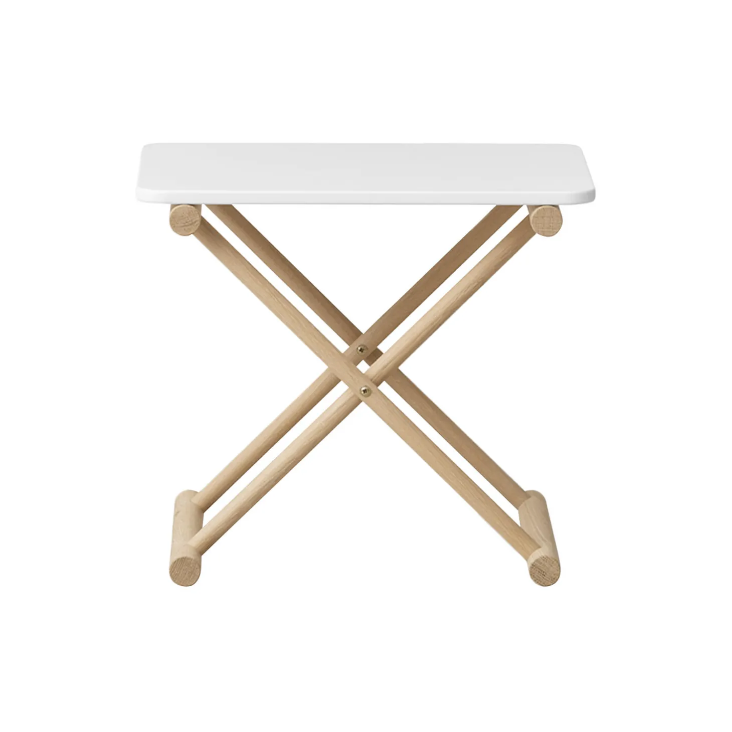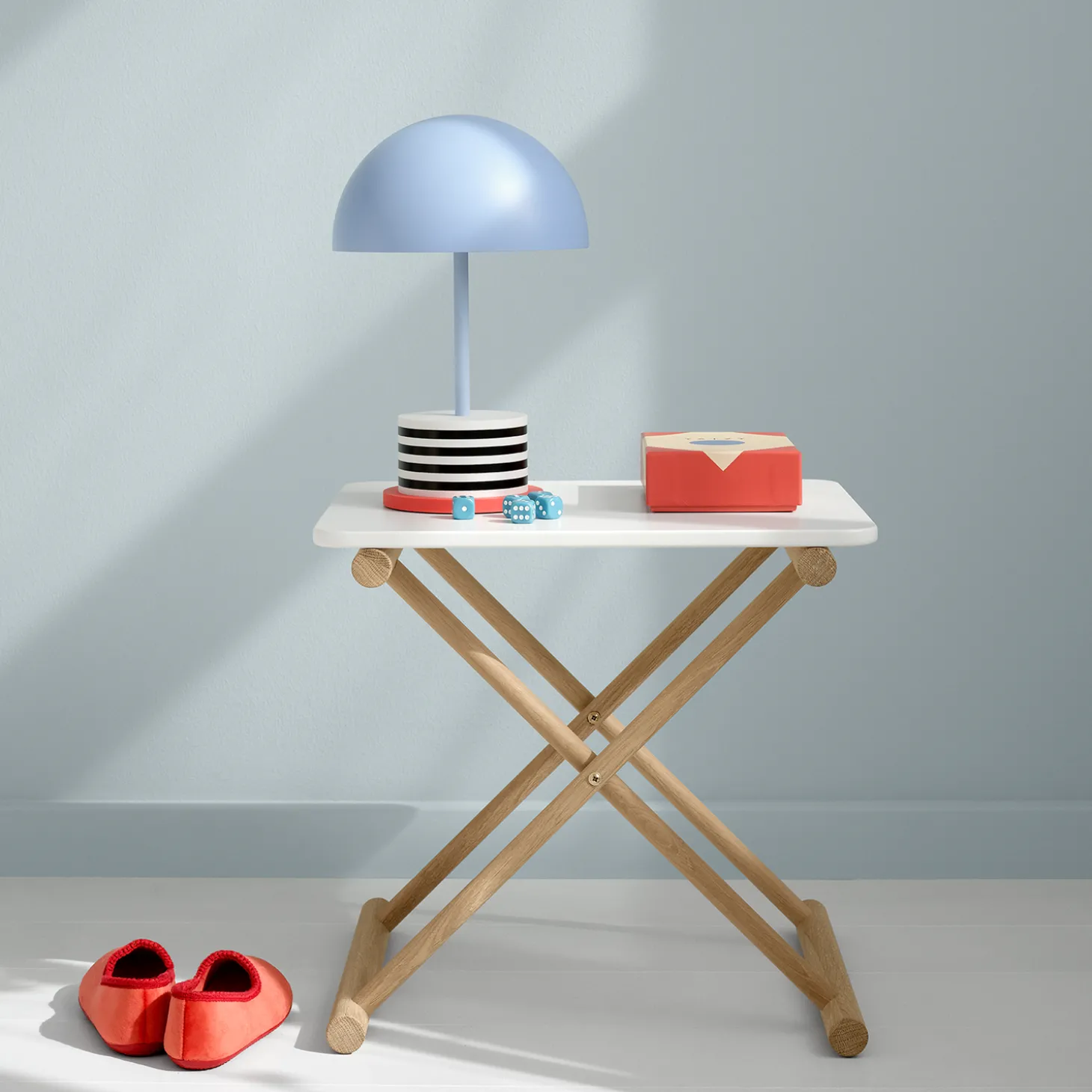 Camp sengebord med et klassisk x-stel i eg og bordplade i enten eg eller hvidmalet MDF er i sit smukke design og delikate forarbejdning, et stilfuldt bud på et natbord til børneværelset, men kan også stå alene eller kombineres med hjemmets øvrige interiør. Bordet fås i både lav og høj version, begge med mulighed for individuel indstilling i to højder, hvor bordpladen let kan fastgøres med to skruer i den ønskede højde.