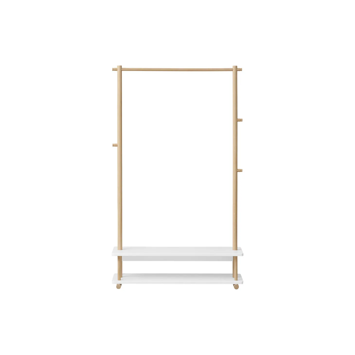 Camp tøjstativ minder i design om himmelsengens ramme, og har plads til såvel balletsko som vandrestøvler på de to hylder forneden. Finurlige detaljer som små runde knager på ydersiden af de smukt formede rundstokke i eg gør det let for børnene at få adgang til og organisere alt fra regntøj til usynlighedskapper.