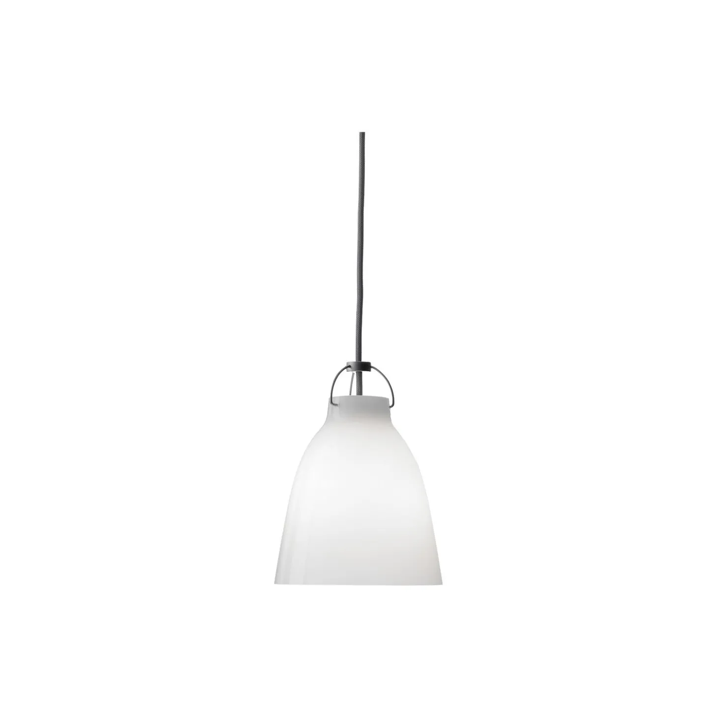Caravaggio™ P1 pendel i 3-lag mundblæst glas og stofledning fra Fritz Hansen. Farve: opal hvid. H: 21,6 x Ø 16,5 cm. Lyskilde: E27. Design: Cecilie Manz.