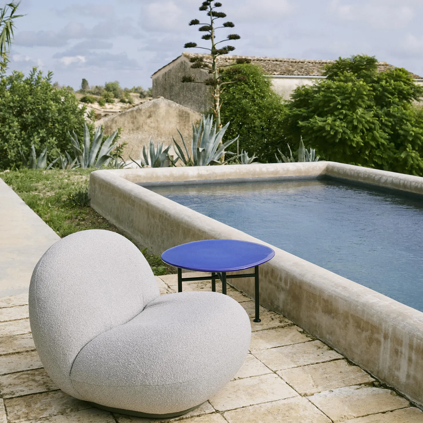 Carmel Coffee Table i glaseret stentøj og pulverlakeret galvaniseret stål fra GUBI. Farve: pacific blue. Mål: H: 40 x L: 60 x B: 60 cm. Design: OEO Studio.