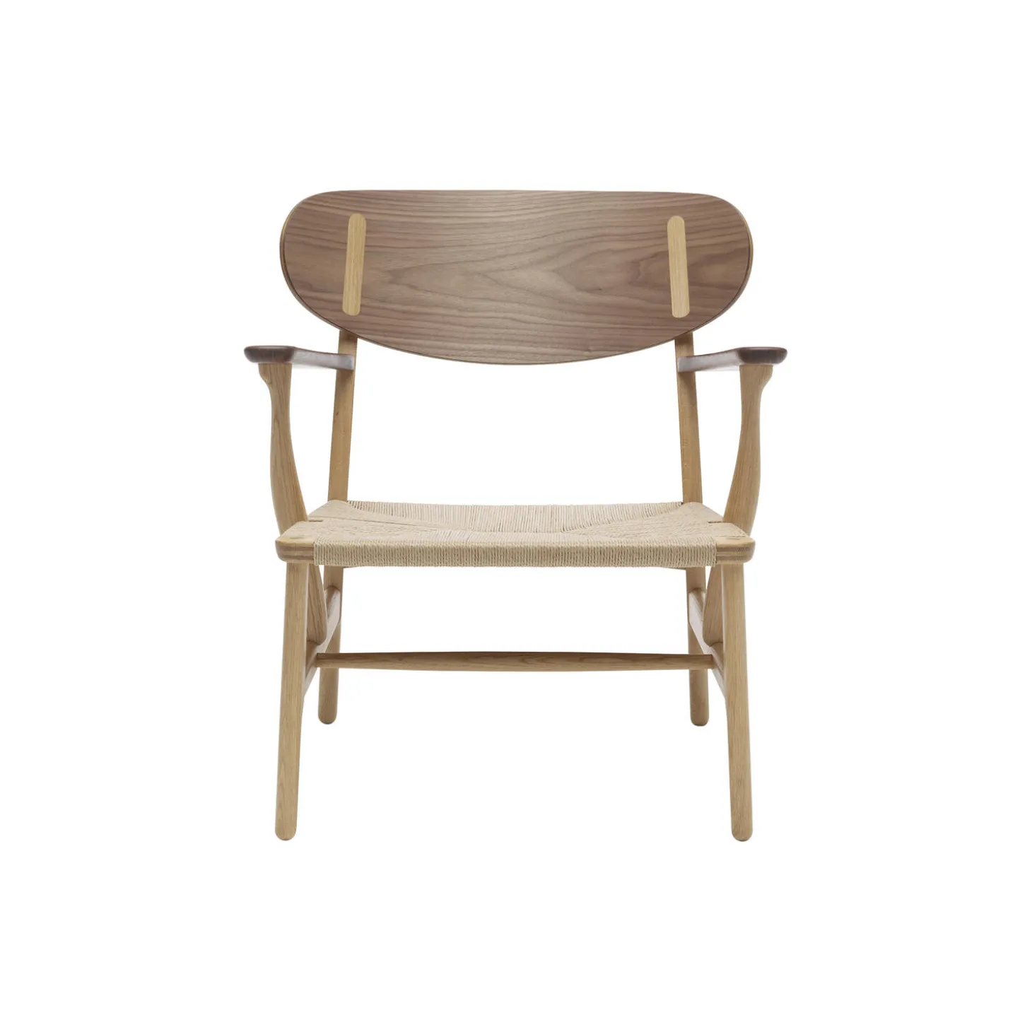 CH22 loungestol i olieret eg med ryg- og armlæn i olieret valnød med sæde i papirgarn fra Carl Hansen & Søn. Farve: olieret eg/olieret valnød/natur. Mål: H: 72,6 x B: 69,5 x D: 61,5 cm. Siddehøjde: 36,8 cm. Design: Hans J.Wegner.