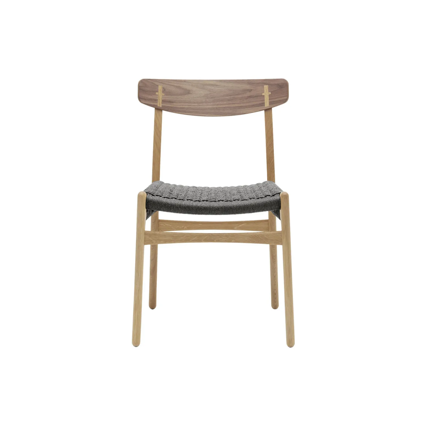 CH23 spisebordsstol i olieret eg med ryg- og armlæn i olieret valnød med sæde i papirgarn fra. Farve: olieret eg/olieret valnød/sort. Mål: H: 78,6 x B: 50,3 x D: 50,3 cm. Siddehøjde: 45 cm. Design: Hans J. Wegner.
