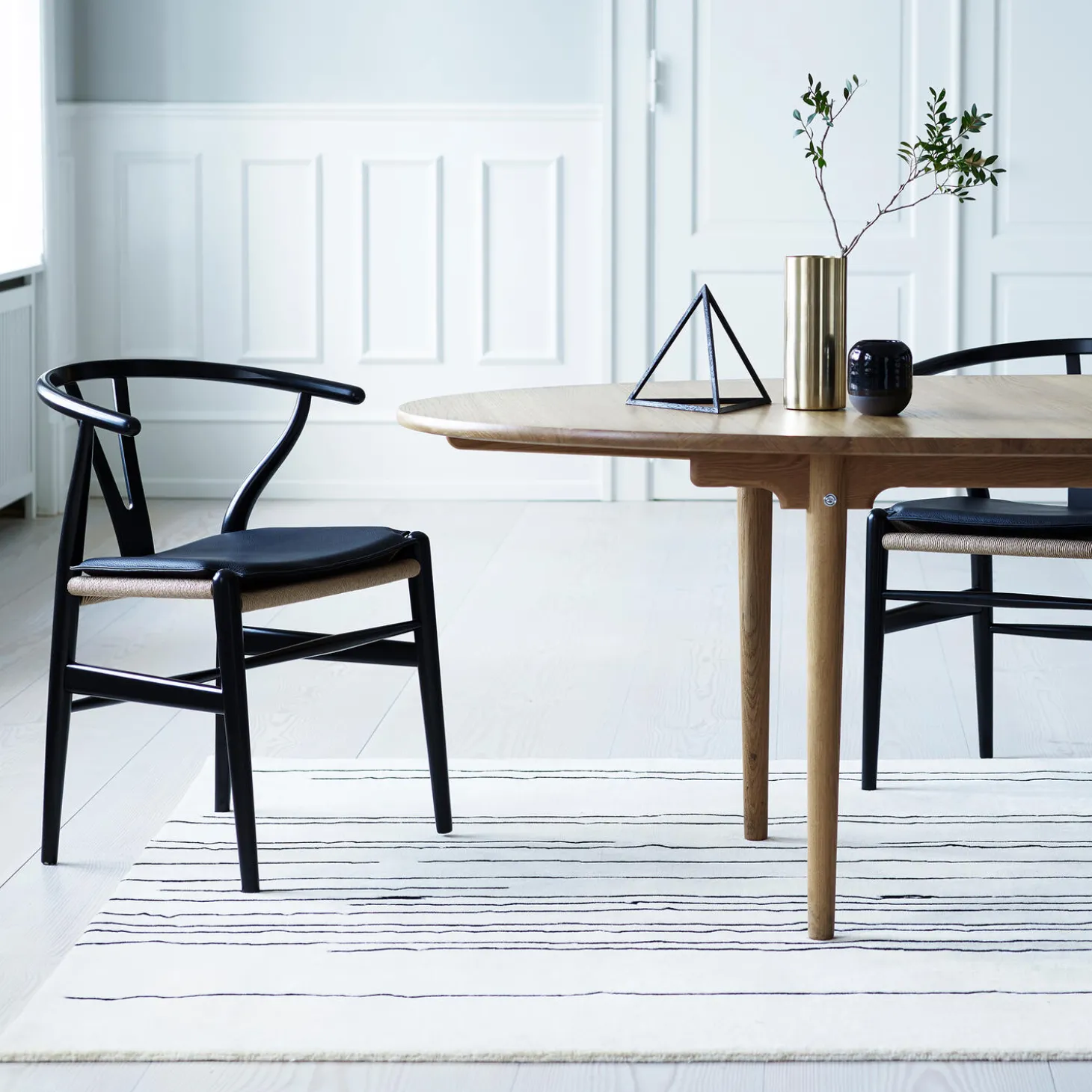 CH24 Y-stolen spisebordsstol i lakeret eg med sæde i papirgarn fra Carl Hansen & Søn. Farve: sortlakeret eg/natur. Mål: H: 76 x B: 55 x D: 51 cm. Siddehøjde: 45 cm. Design: Hans J. Wegner.