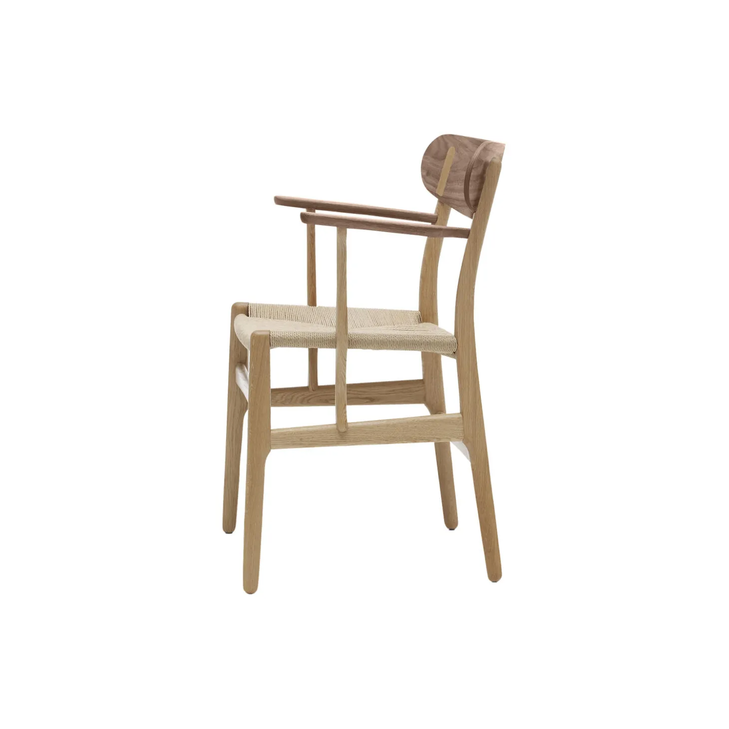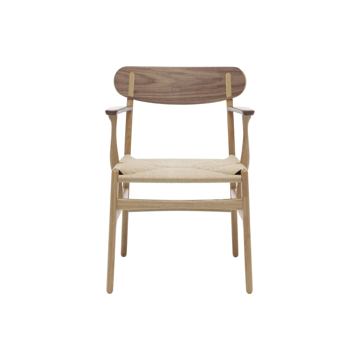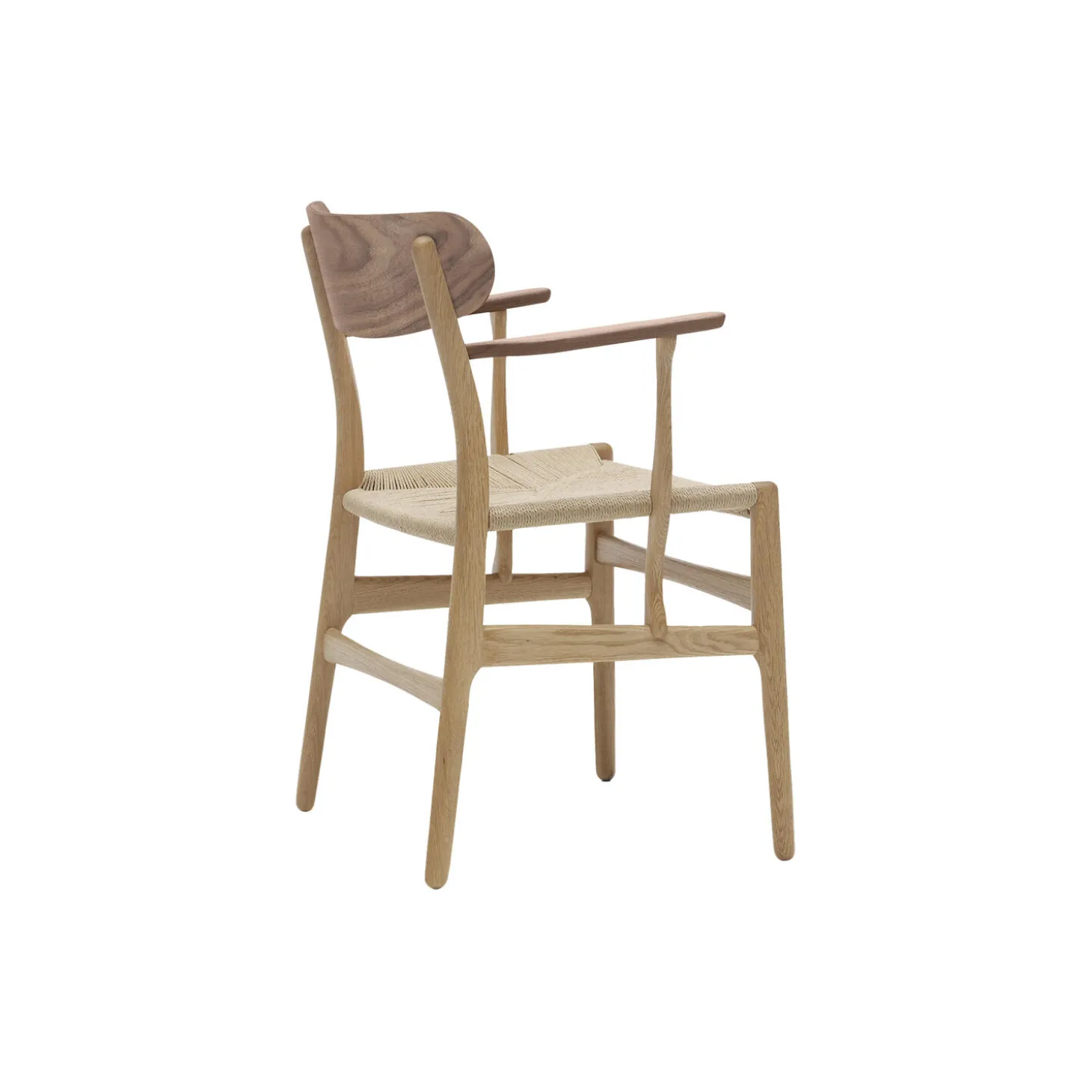 CH26 spisebordsstol i olieret eg med ryg- og armlæn i olieret valnød og sæde i papirgarn fra Carl Hansen & Søn. Farve: olieret eg/olieret valnød/natur. Mål: H: 79,8 x B: 59,2 x D: 51,9 cm. Siddehøjde: 44,5 cm. Design: Hans J.Wegner.