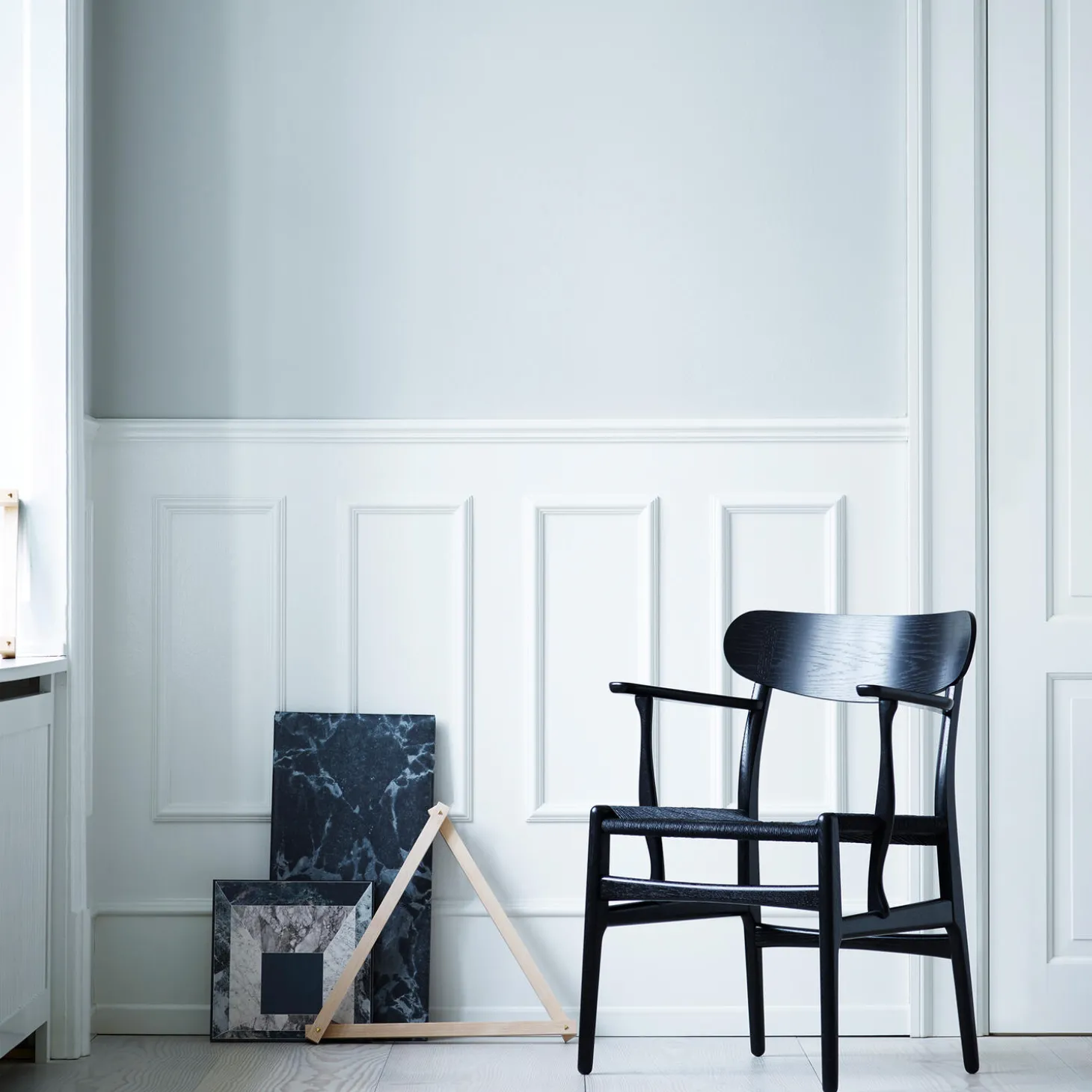 - Materiale: sortlakeret eg med sæde i papirgarn