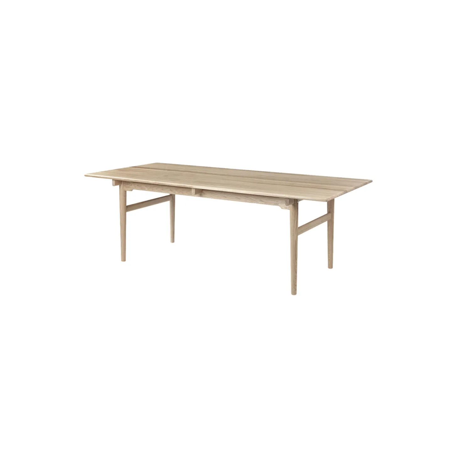 Hans J. Wegners CH327 spisebord til seks personer fra 1962 har et usædvanligt design med en bordplade, der nærmest syner svævende. CH327T tillægsplader tilkøbes seperat.
