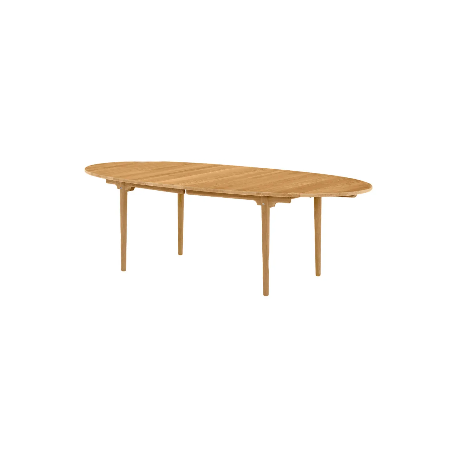 Det funktionelle CH339 spisebord med elliptisk plade og plads til otte personer er ligesom CH338 en længere variant af Hans J. Wegners spisebord CH337 fra 1962. CH339I tillægsplader tilkøbes seperat.