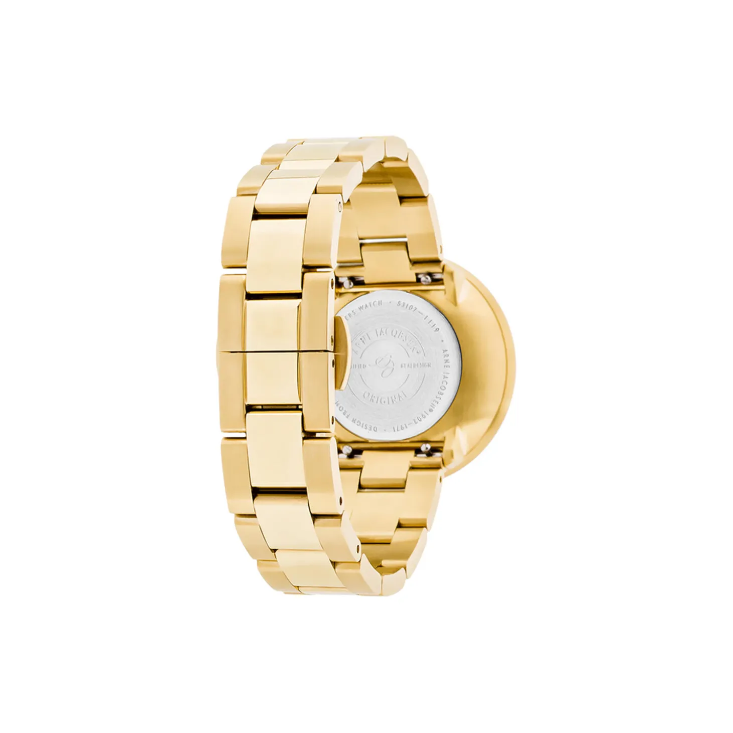 Arne Jacobsen City Hall wrist watch with polished gold 16 mm bracelet with butterfly buckle. The dial on this watch is 34 mm.