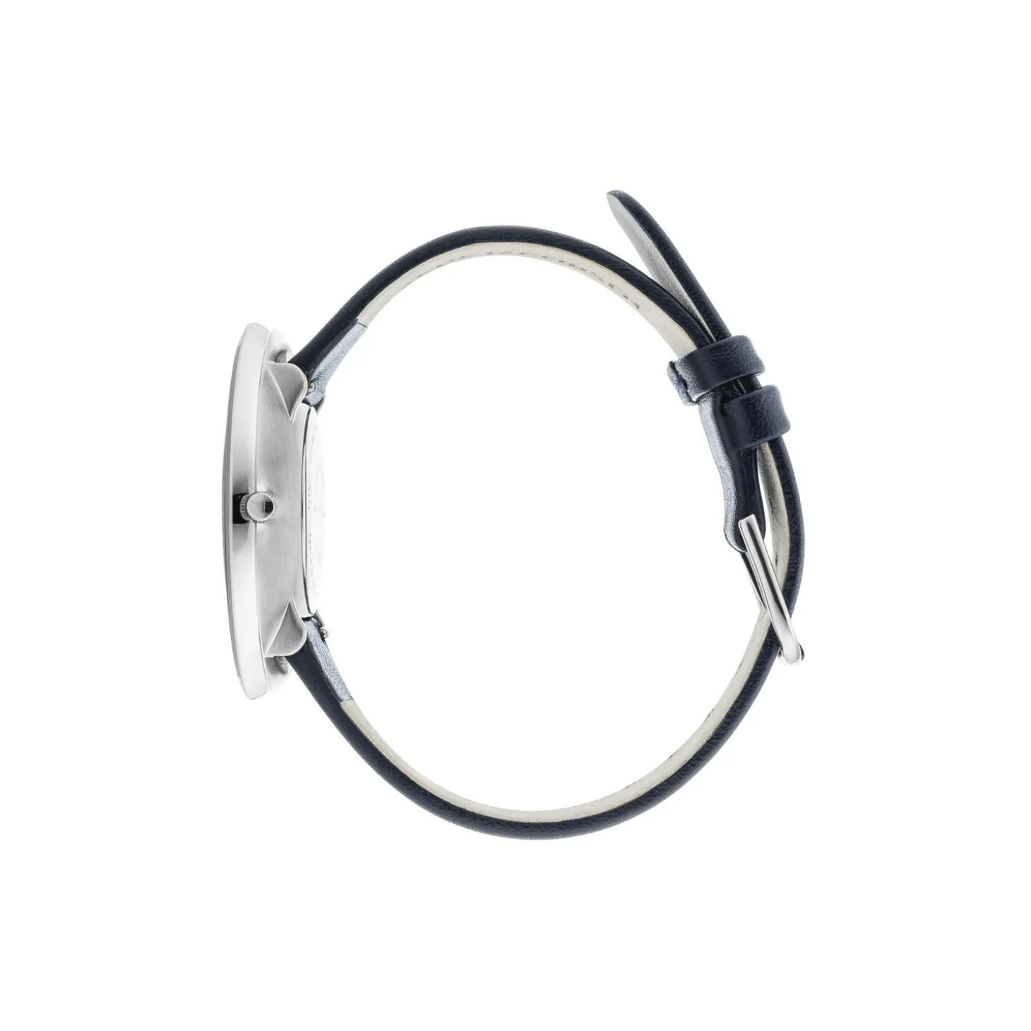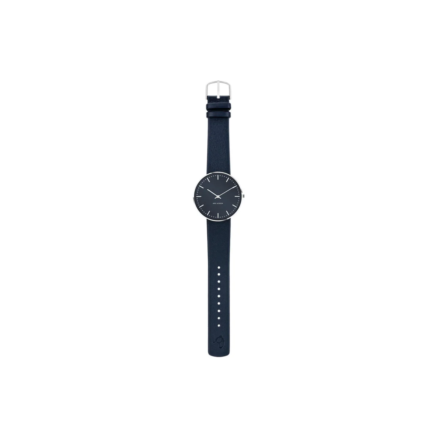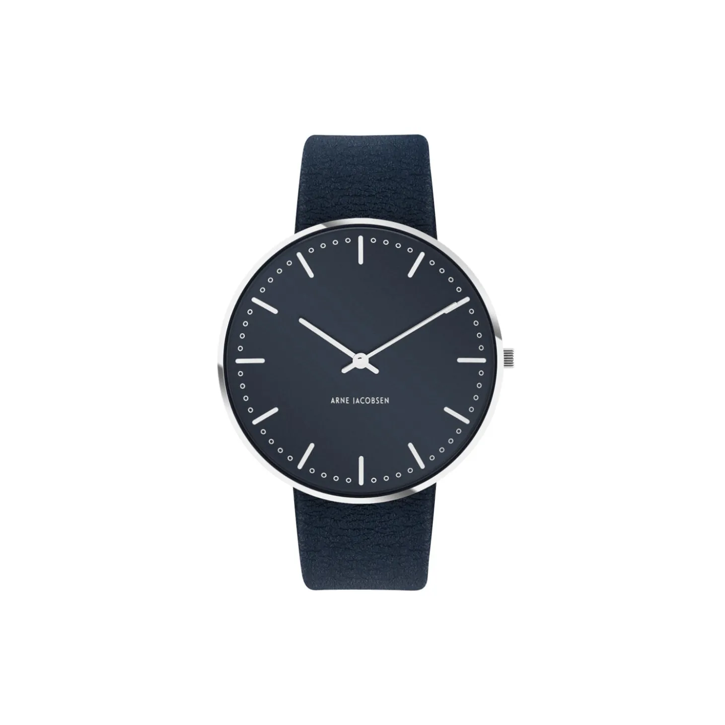 Arne Jacobsen City Hall wrist watch with oxford blue 20 mm leather strap in calf-skin with polished steel buckle. The dial on this watch is 40 mm.