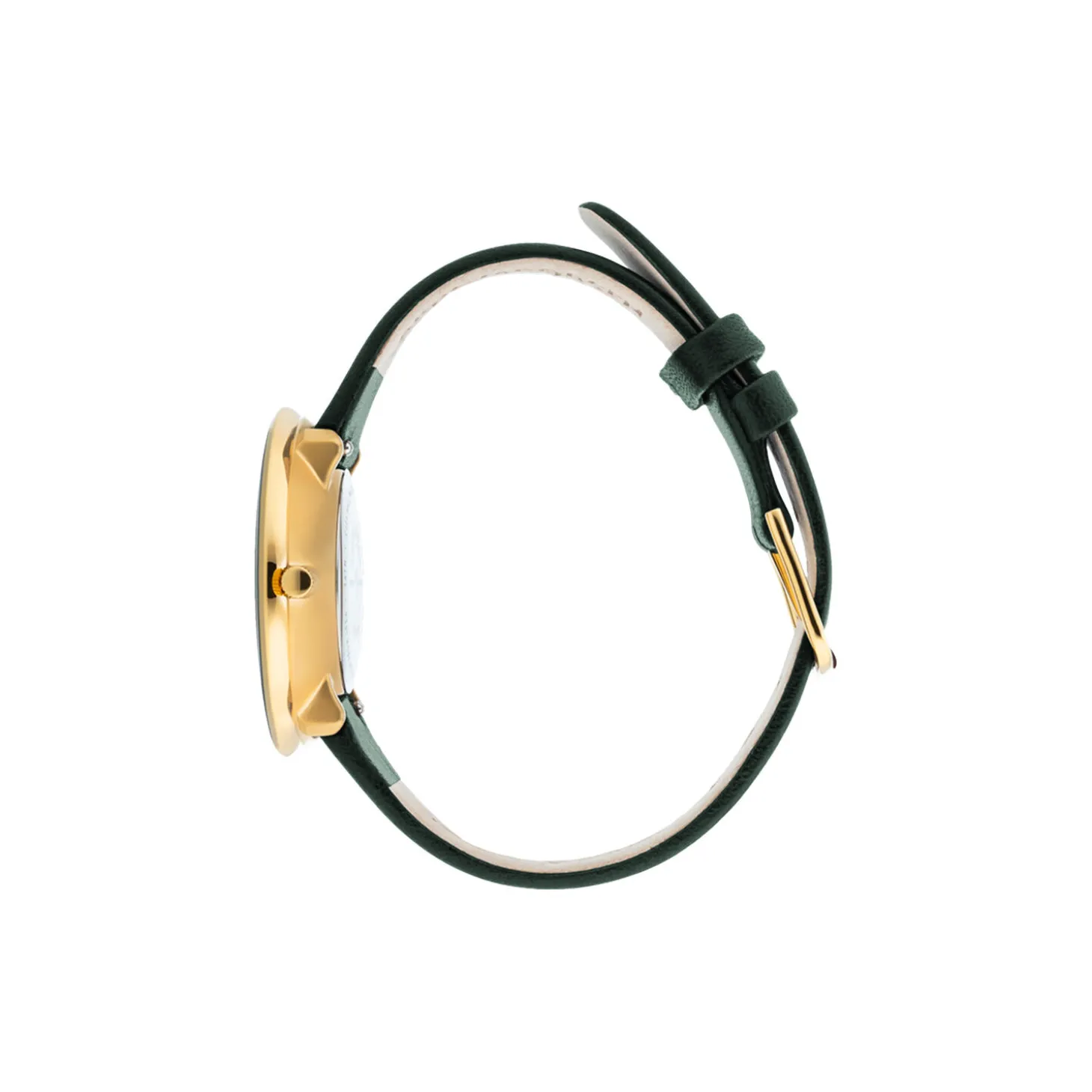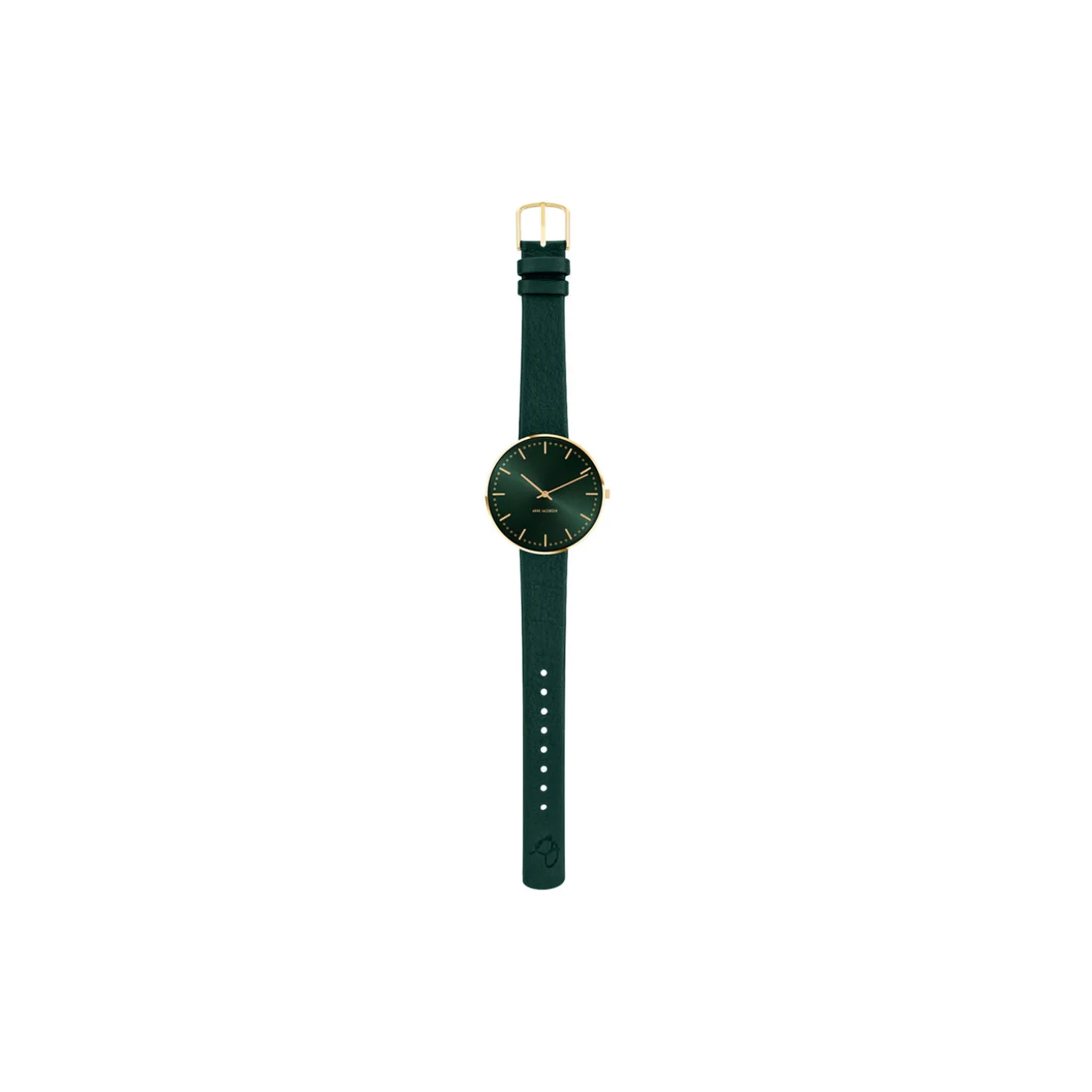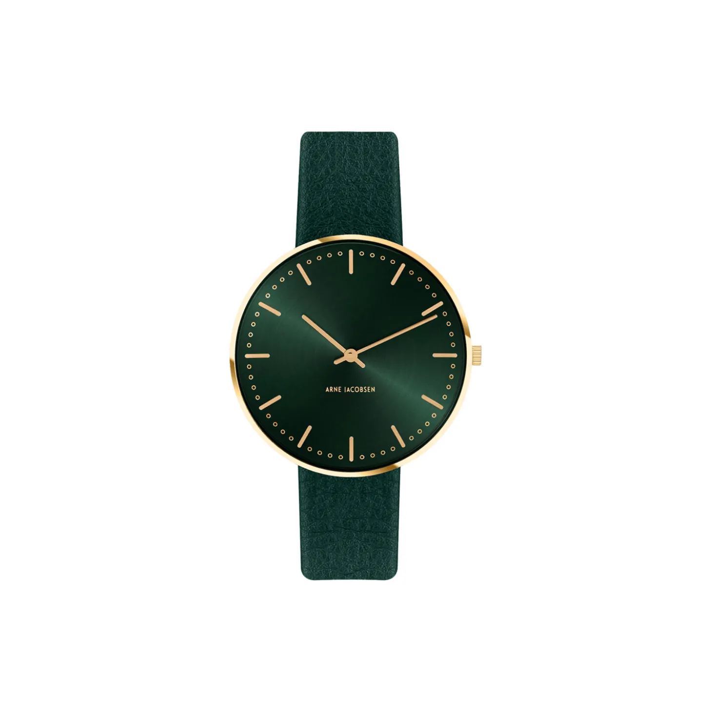 Arne Jacobsen City Hall wrist watch with evergreen 16 mm leather strap in calf-skin with brushed gold buckle. The dial on this watch is 34 mm.